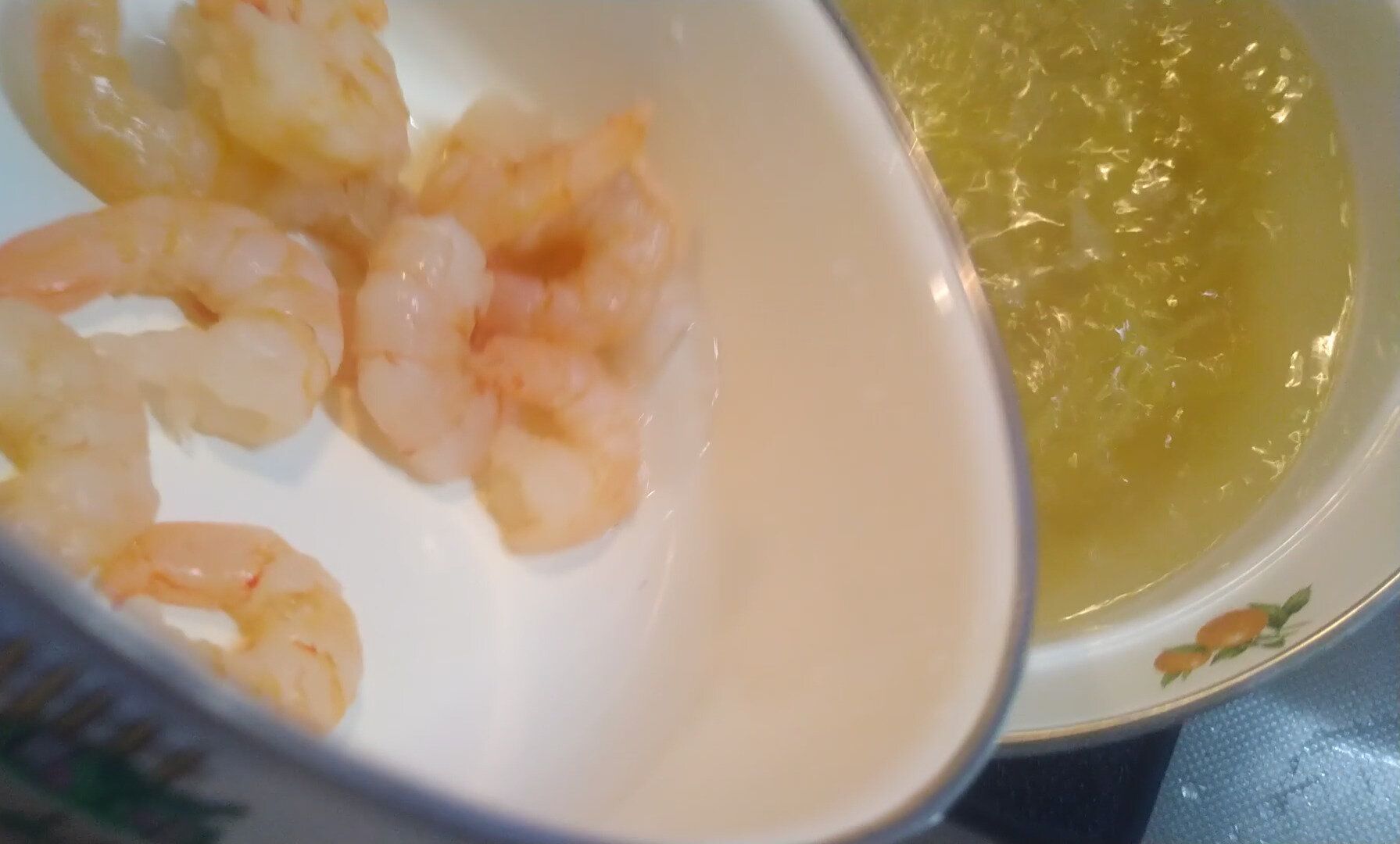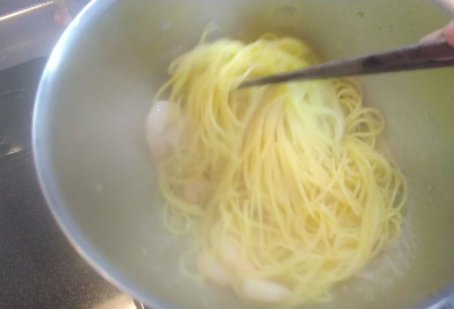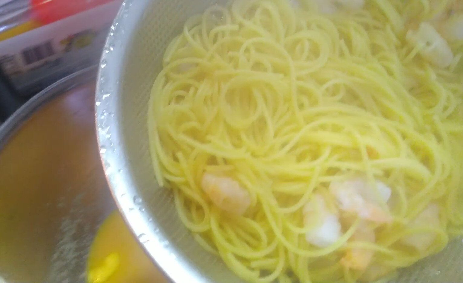 スパゲッティ茹で上がりの2分前になったら、解凍されたエビを鍋に投入!