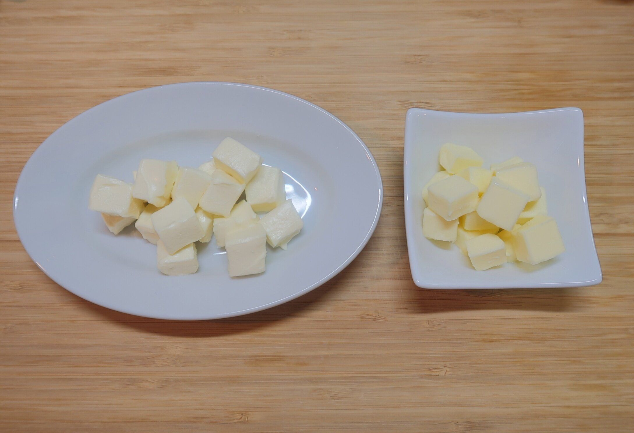 クリームチーズ、バターはそれぞれ約1cm角にカットし、冷蔵庫で冷やしておきます。