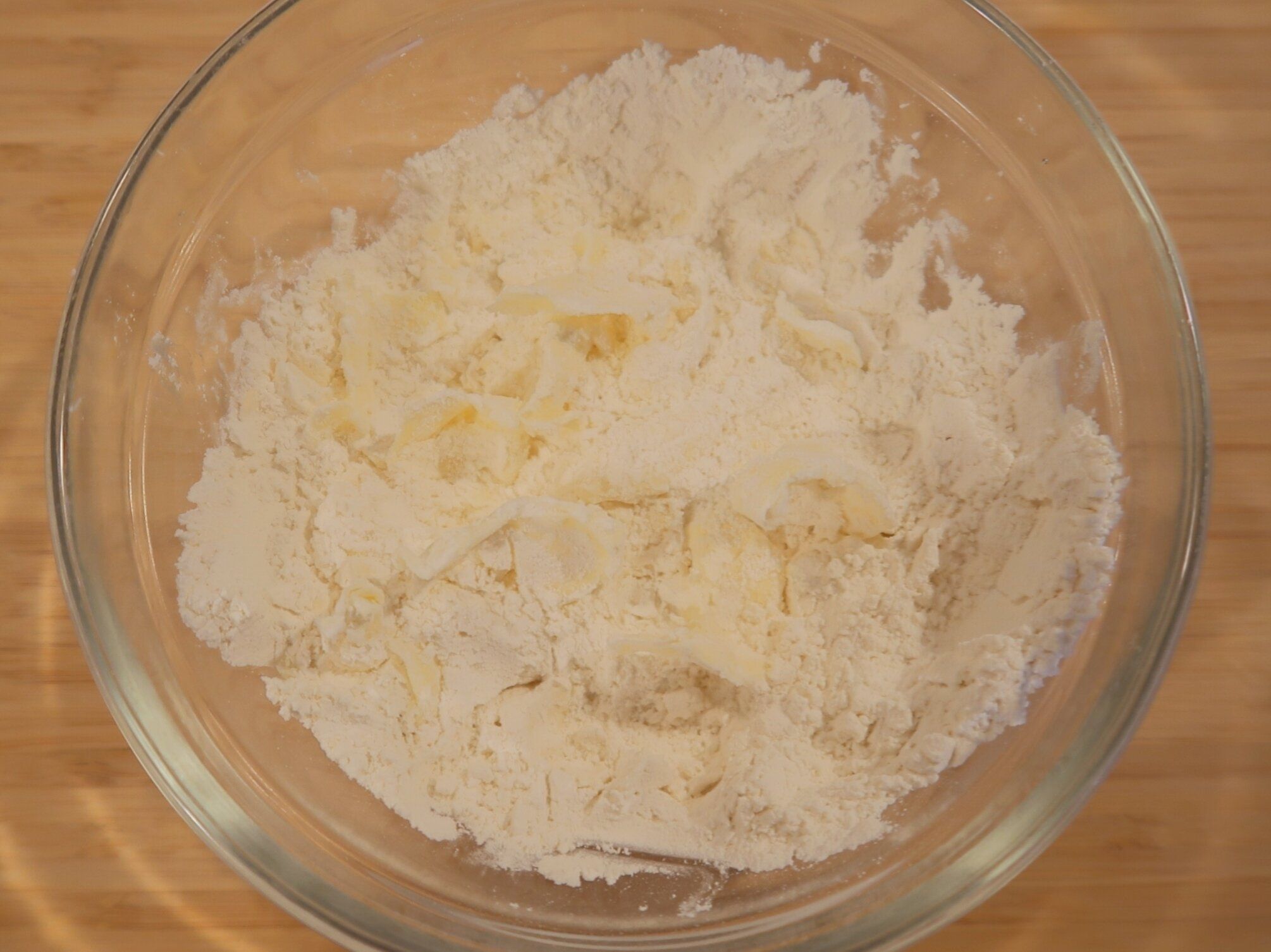 ボウルにホットケーキミックスと冷やしたバターを入れ、かるく混ぜ合わせます。
