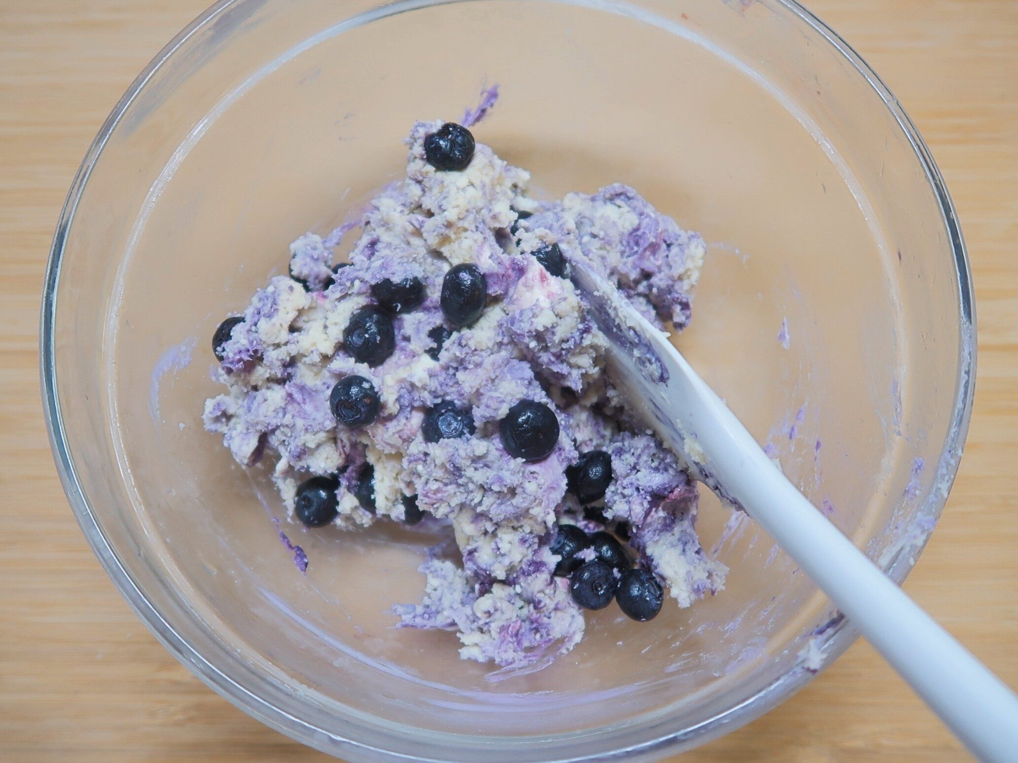 最後に冷凍ブルーベリー、クリームチーズを加えゴムベラでさっくりと混ぜ合わせます。