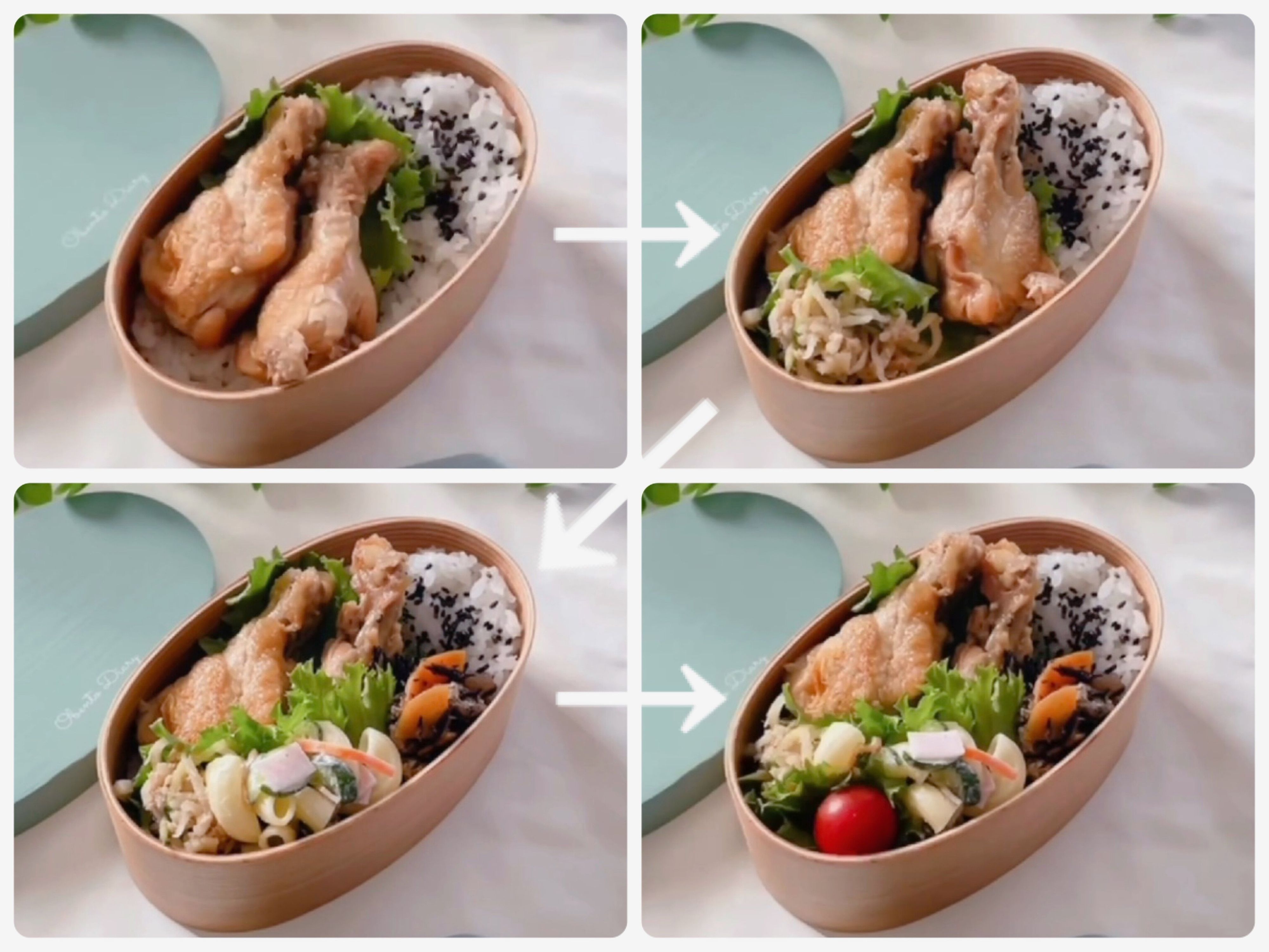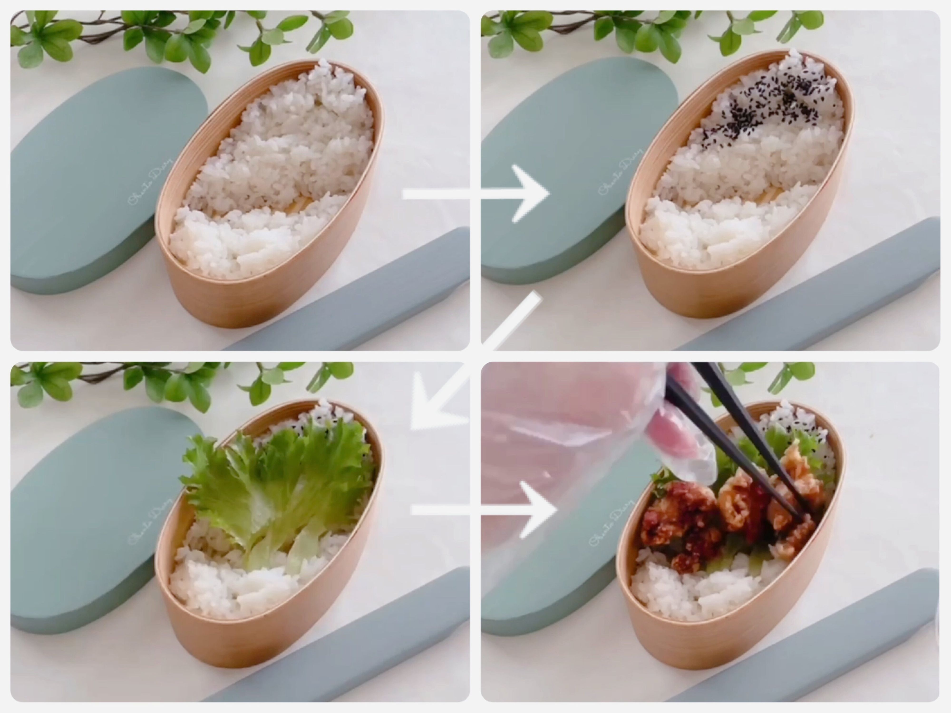 お弁当箱にごはんを詰めてちょっとくぼみをつけたら奥側にメインおかず、その次に左手前に副菜を詰めて玉子焼きやミニトマトはいつも同じ場所に詰めるとパパッと詰める事ができるようになり時短になります。