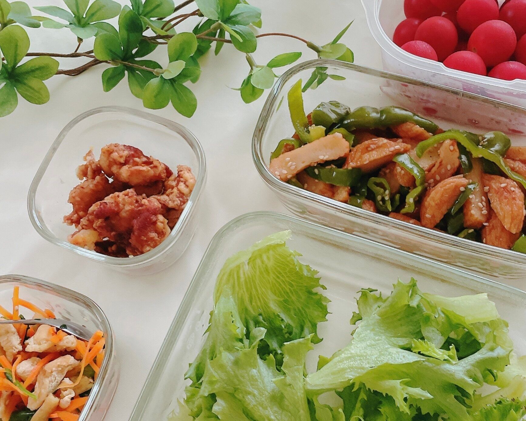 副菜3種はつくりおきしていたものなのでただ詰めるだけ!レタスをしいて盛り付ければぐんと華やかになります。