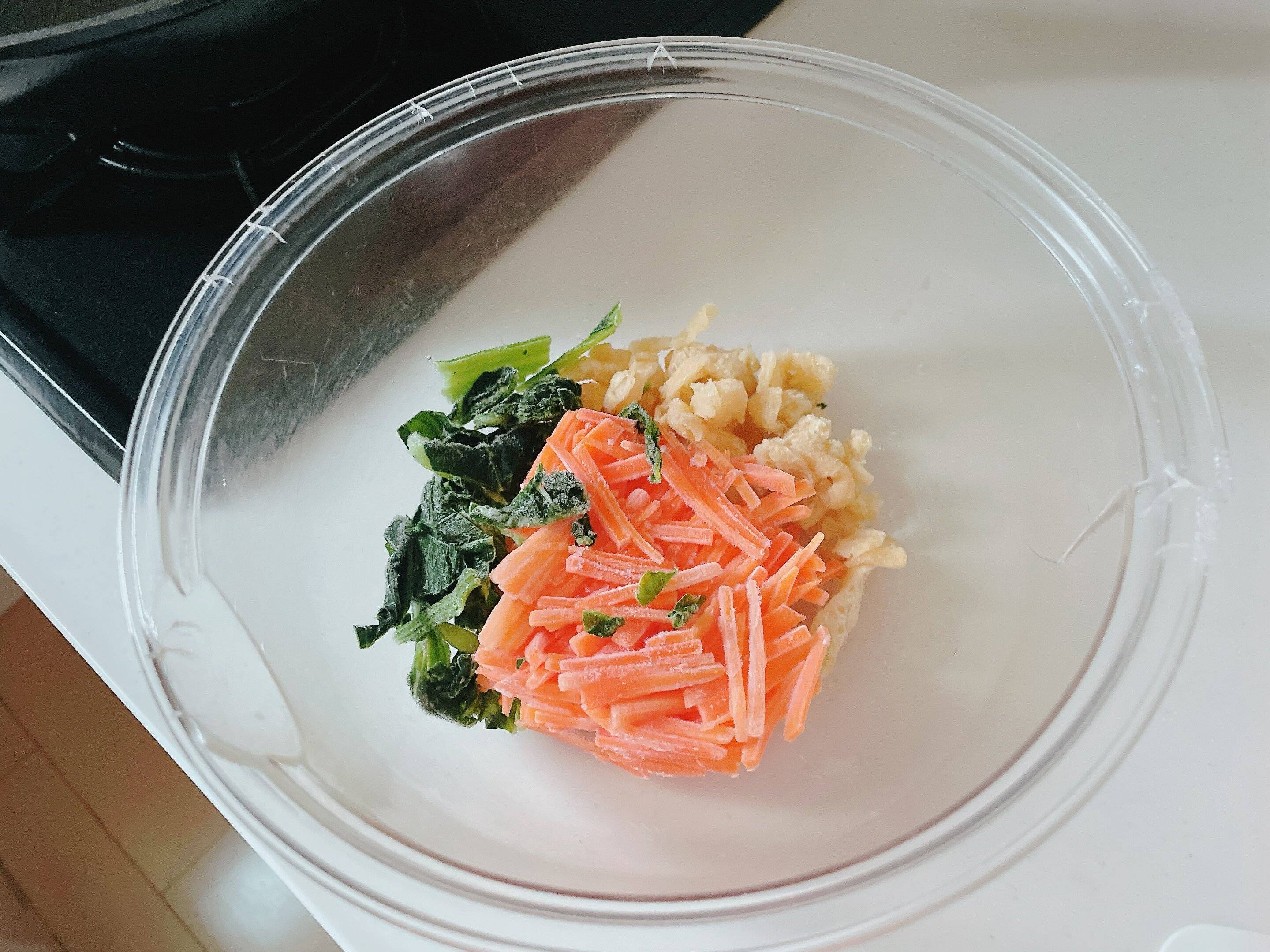 (2)耐熱ボウルに、人参、油揚げ、冷凍ほうれん草を入れてラップをふんわりかけ、電子レンジ600Wで2分半加熱。