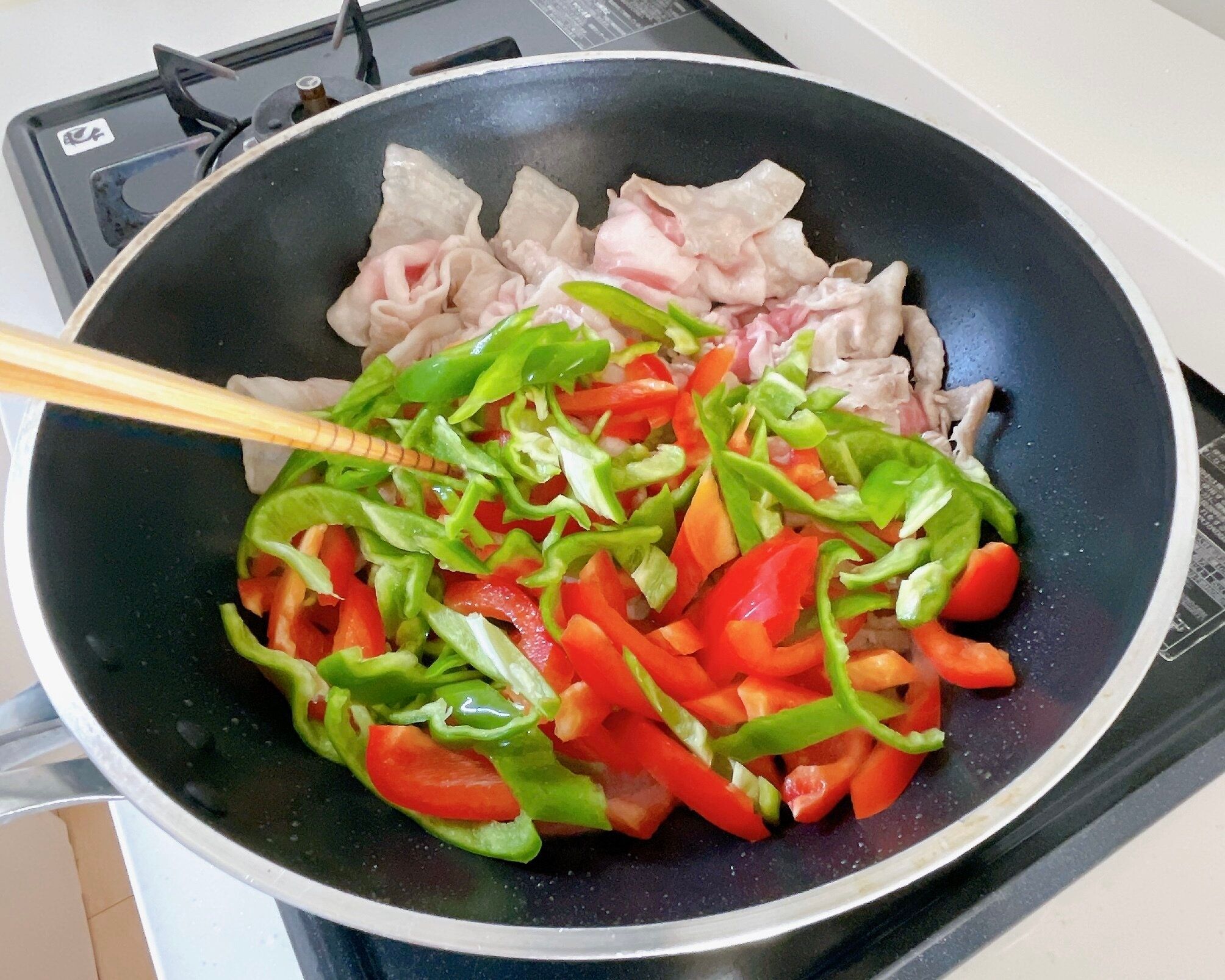 (2)フライパンにごま油をひき、豚バラ肉を入れサッと炒め、パプリカとピーマンも入れてよく炒める。