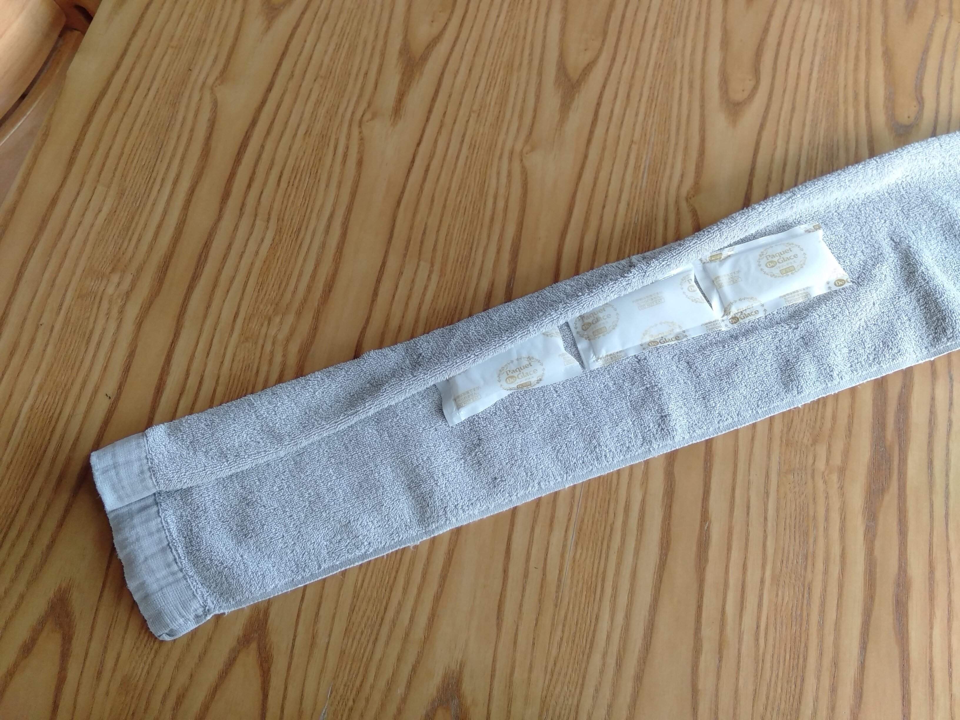 保冷剤を何個かタオルでくるみ、首を冷やすこの方法だと手軽で繰り返し使え、エコなので続けやすいのも良いところ。