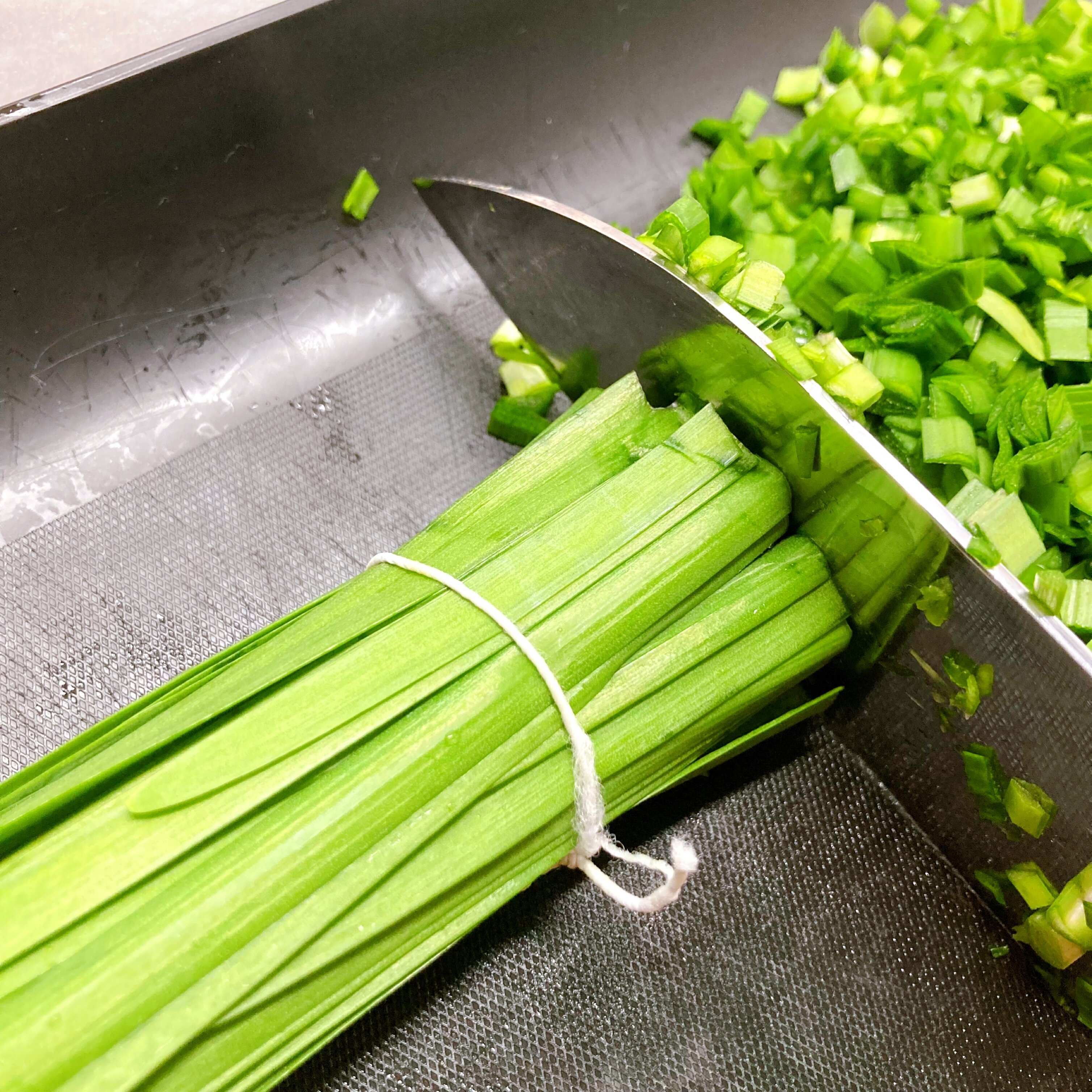 ニラは洗って、根元を少し切り落とし、細かく刻みます。