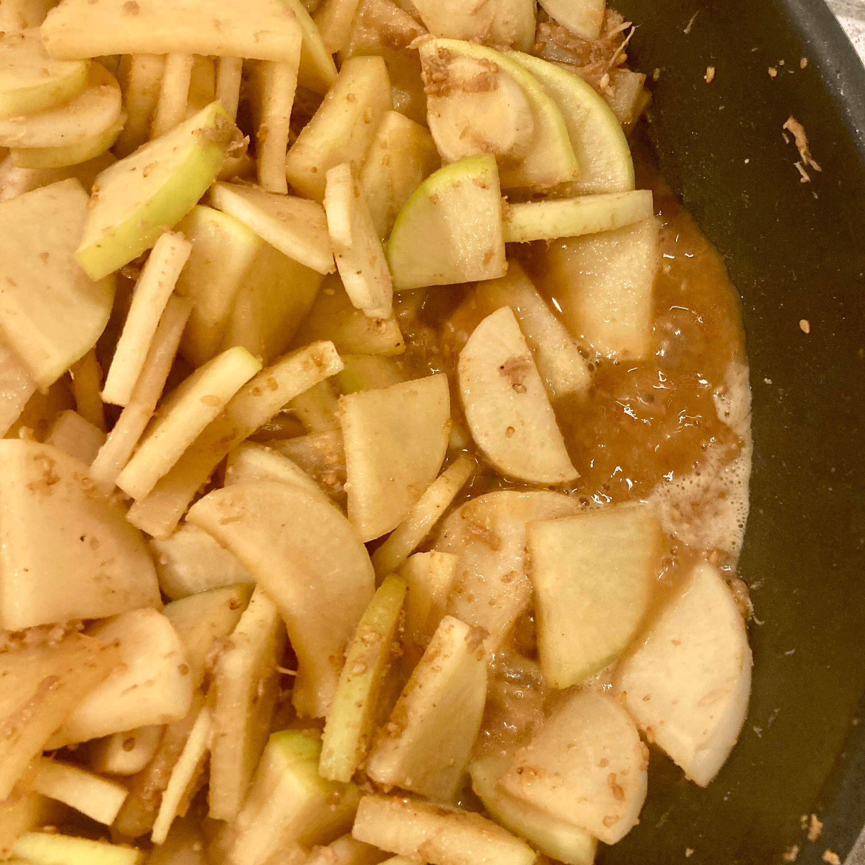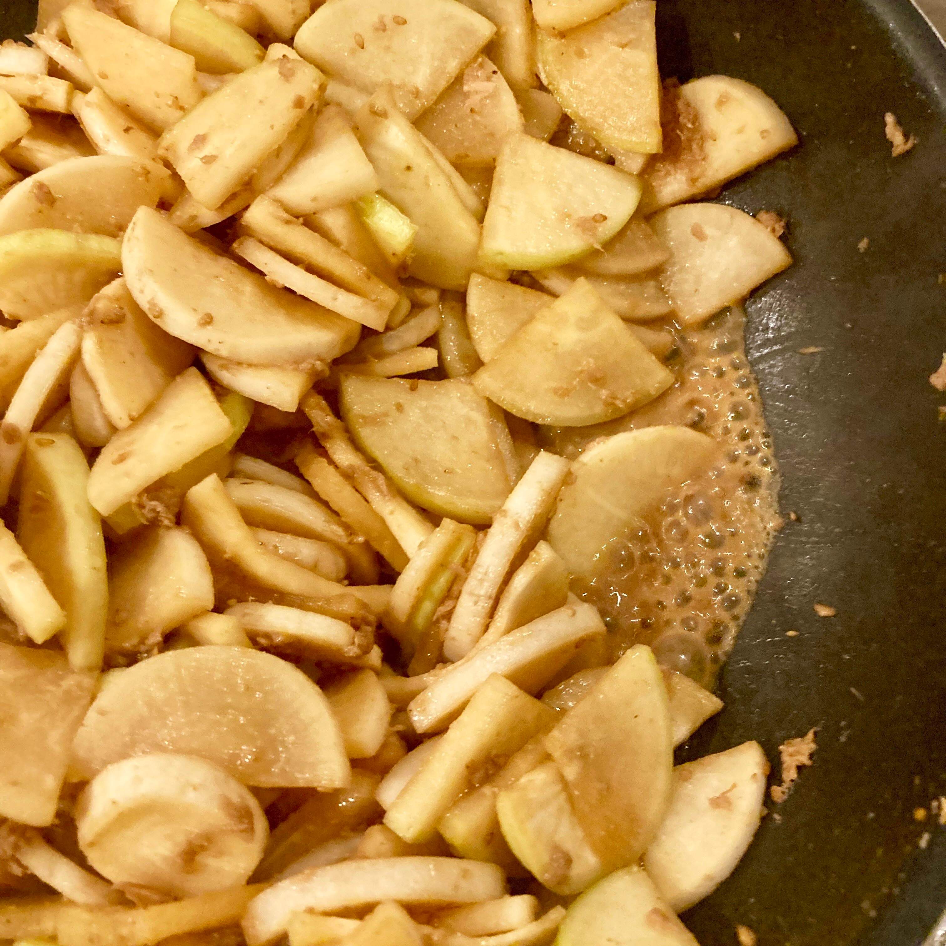 酒・醤油を入れて、炒め煮のような形で火を通します。煮汁が煮詰まってきたらできあがり。