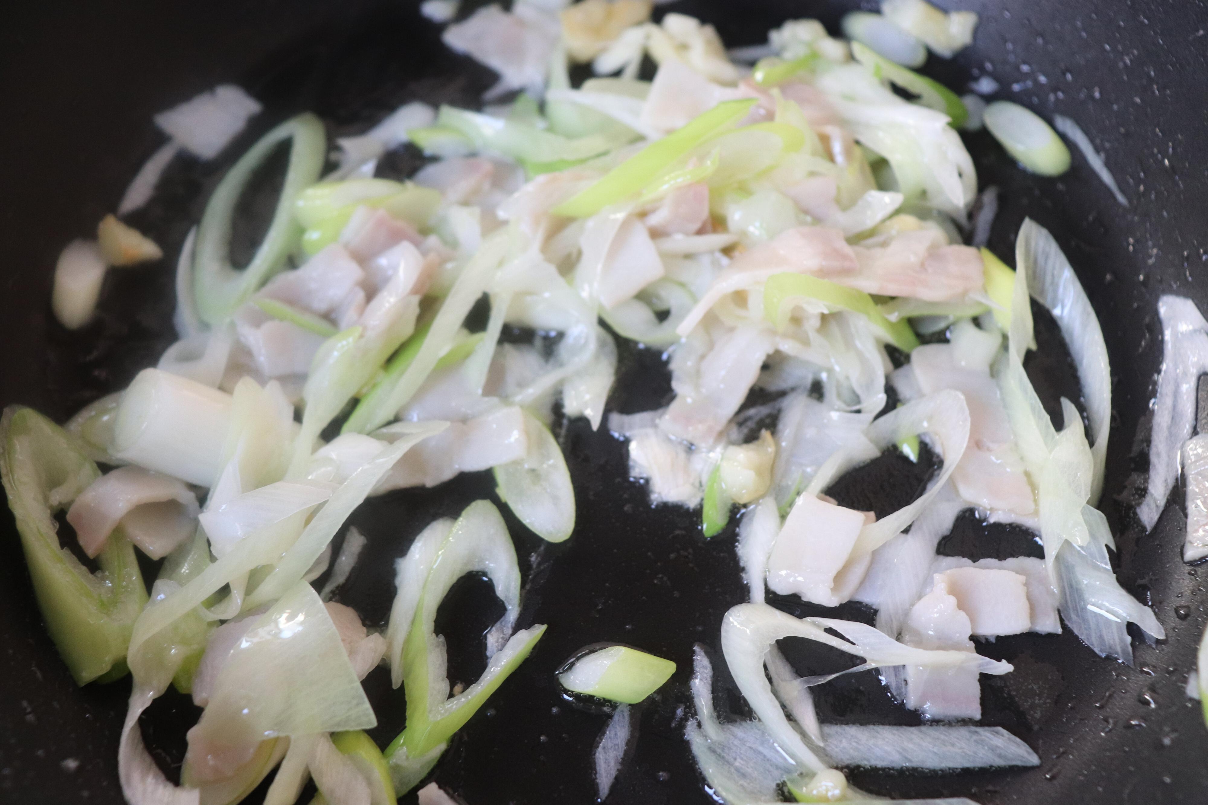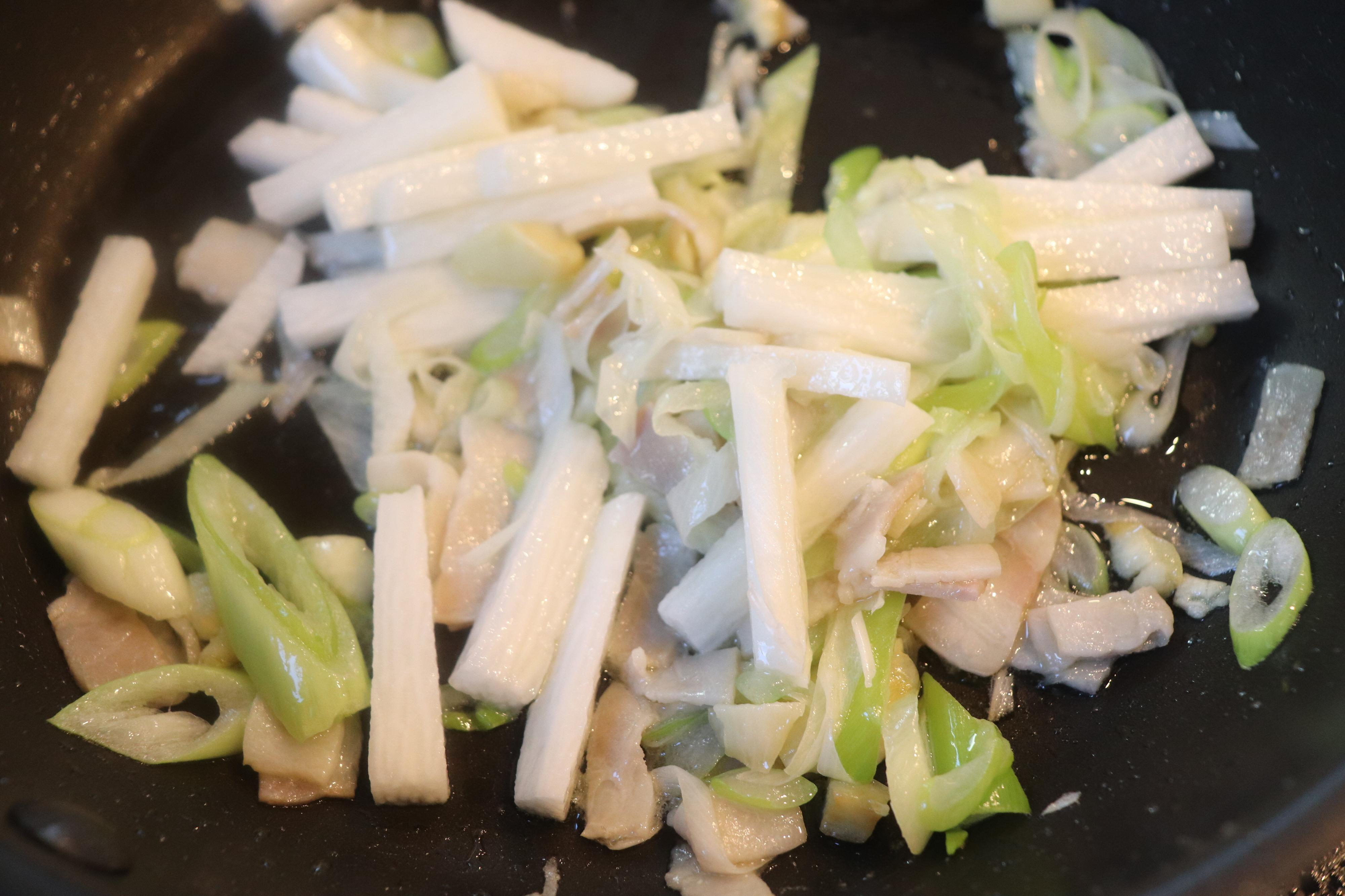工程2:ベーコン、長ネギを加えて炒める。