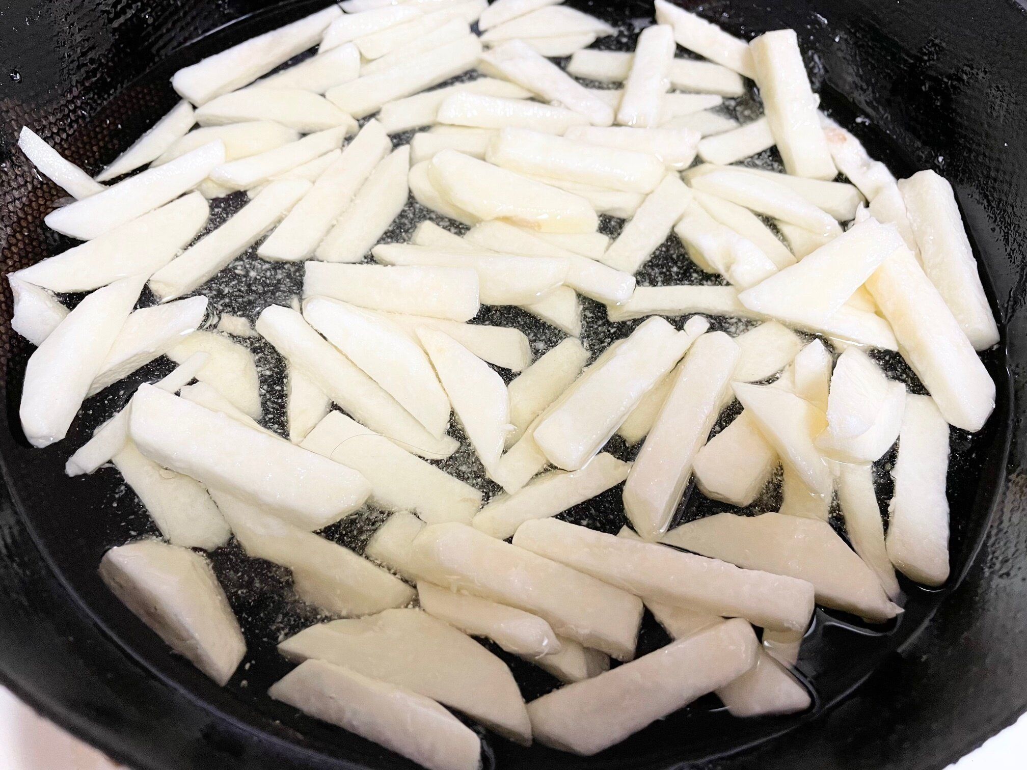 フライパンに2cmほど油を入れて、火をつけない状態でじゃがいもを入れます。これが2つめのコツです。