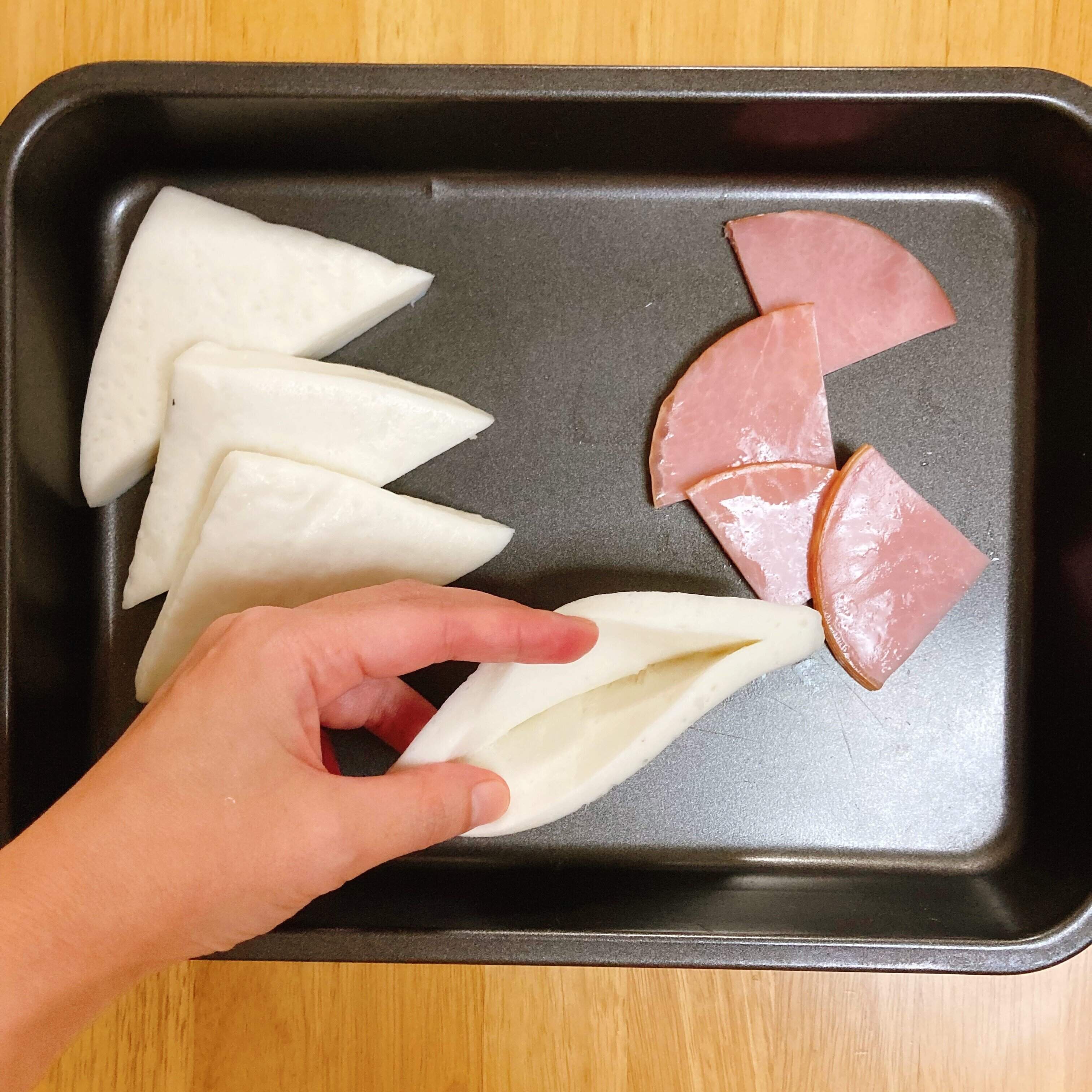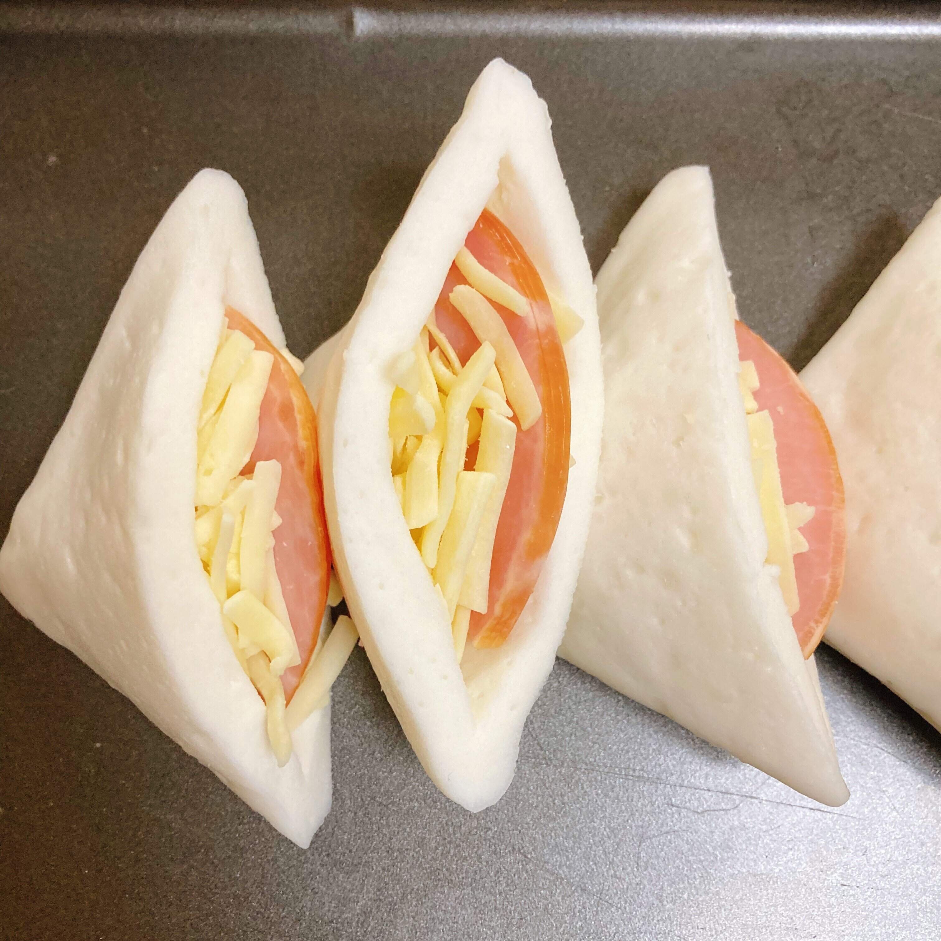 4等分に切ったハムとチーズを詰める。