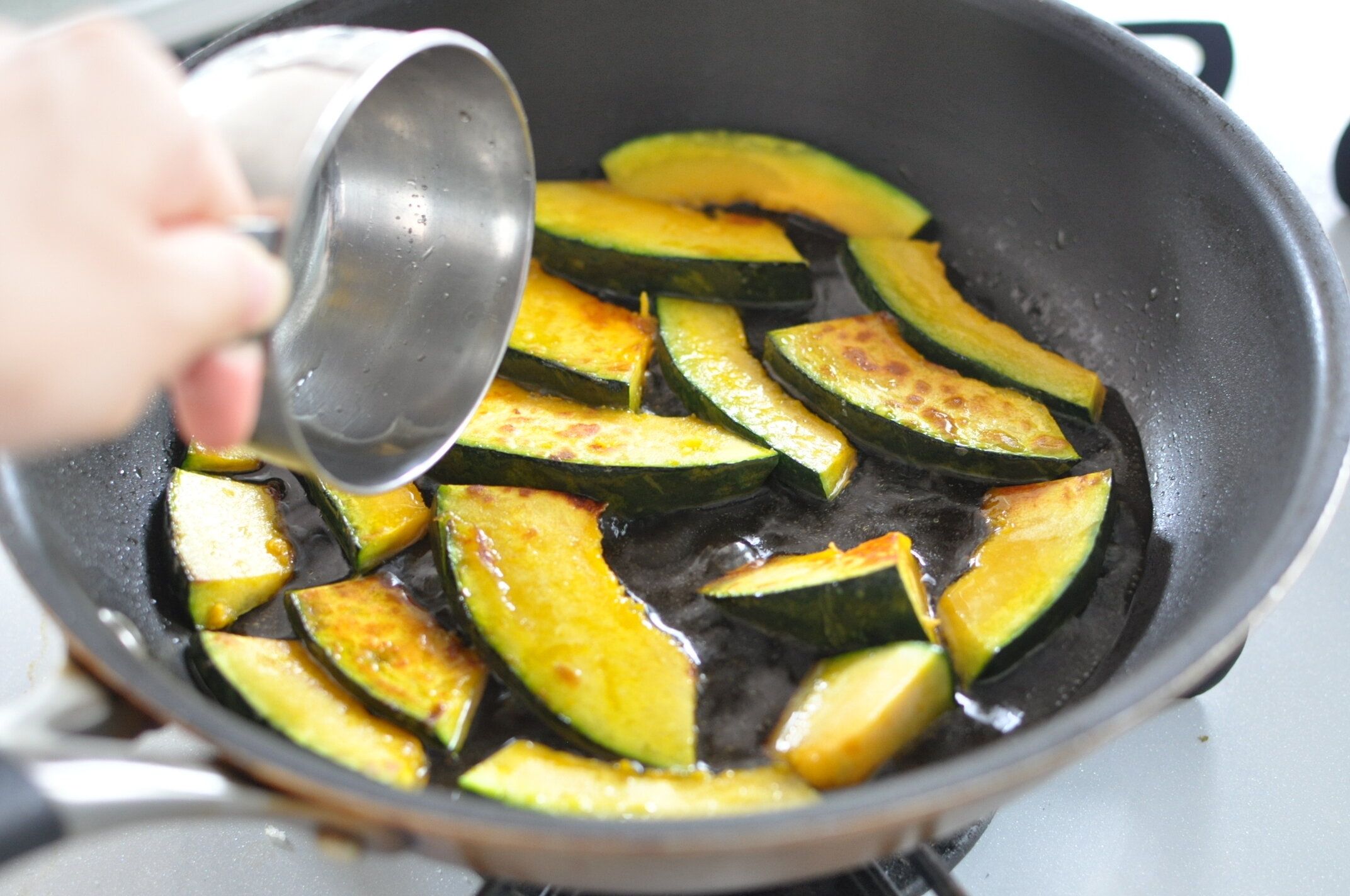 フライパンに油大さじ2(分量外)を入れて温め、かぼちゃを並べて焼きます。