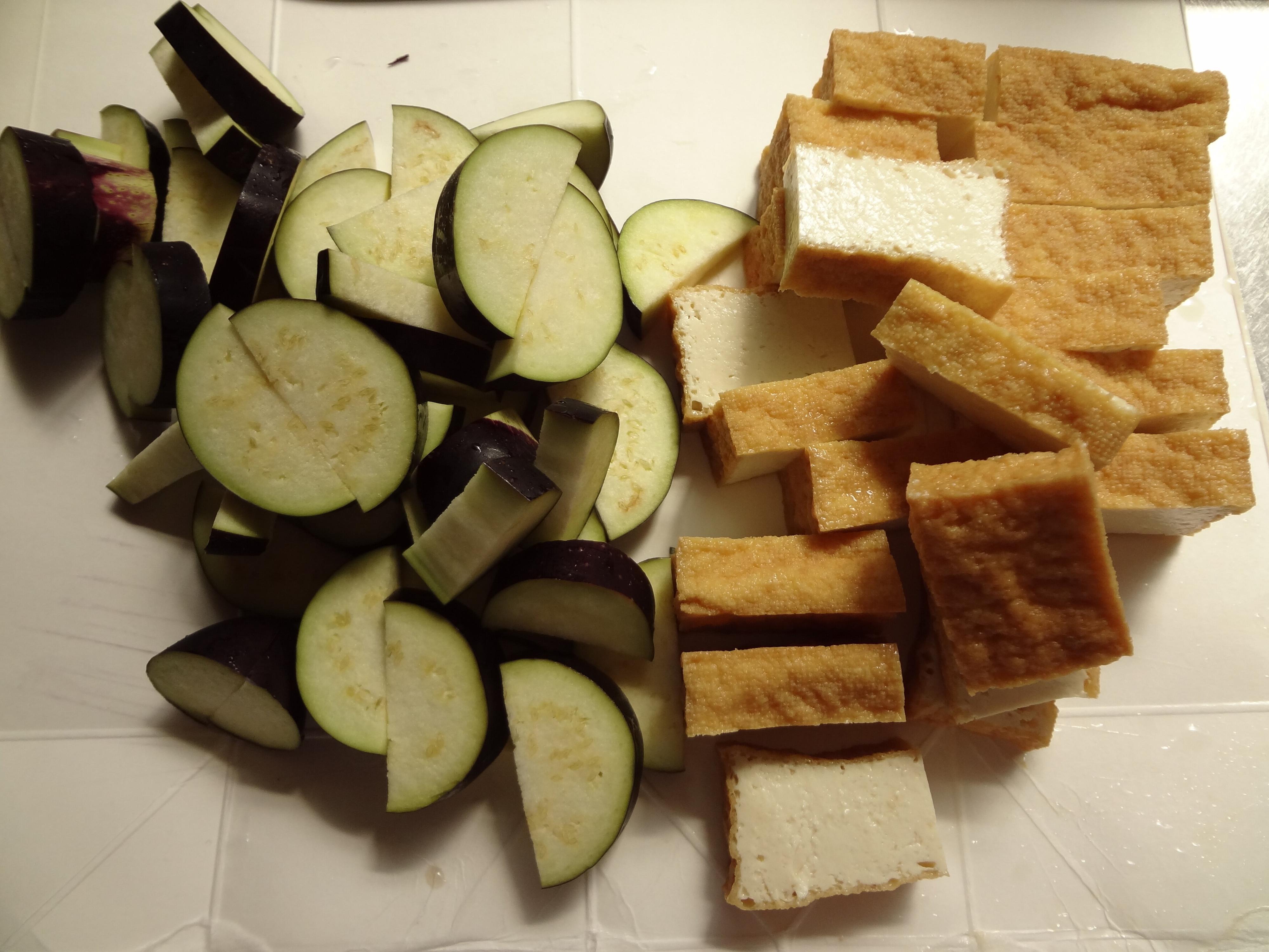 1.ナスは1cm幅の半月切りにし、厚揚げは横に半分に切り1cmの厚さで切ります。