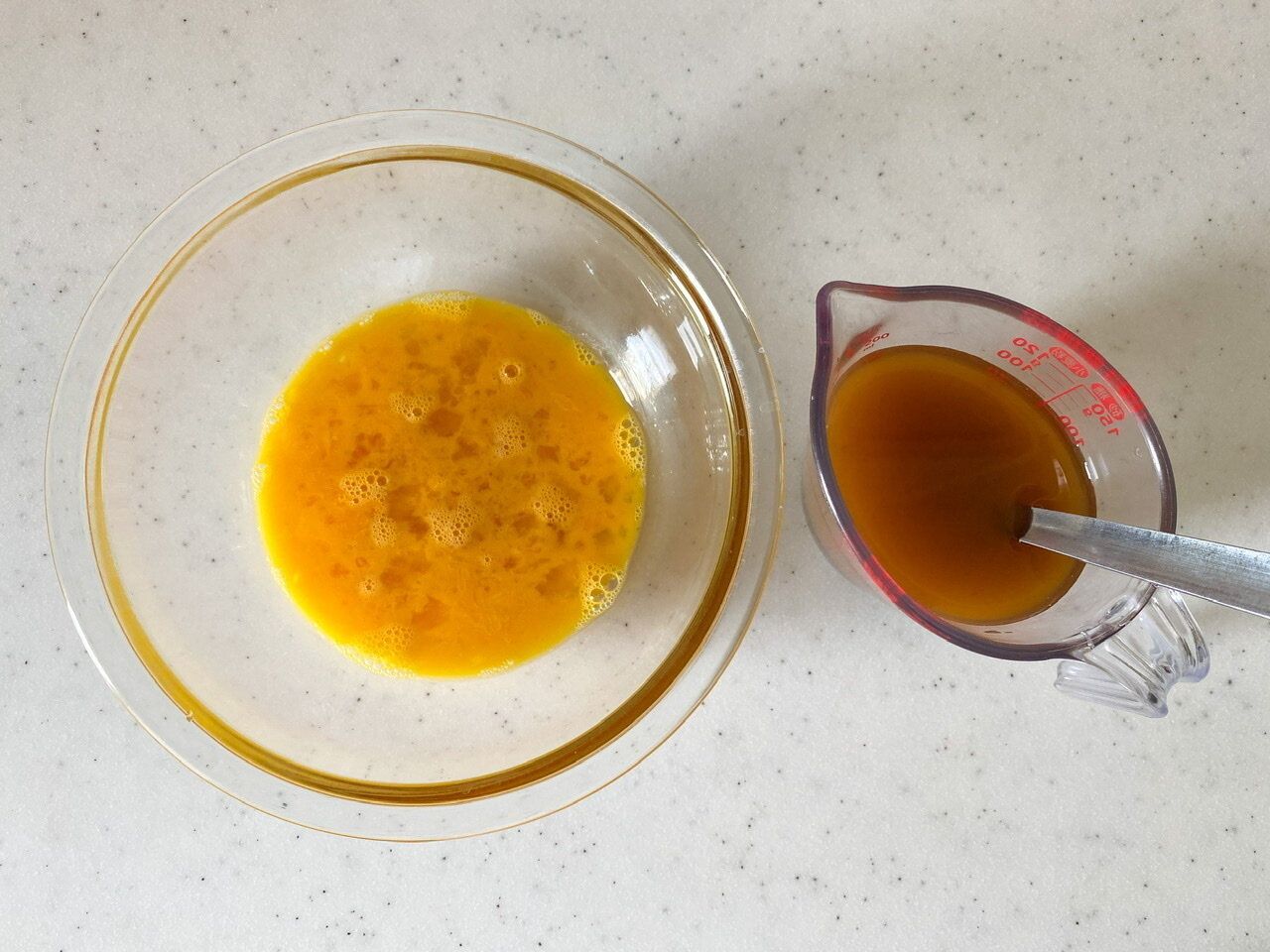 (1)卵をボウルに溶きほぐし、Aを加えてよく混ぜる。計量カップに分量の水を入れ、Bを加えて混ぜておく。