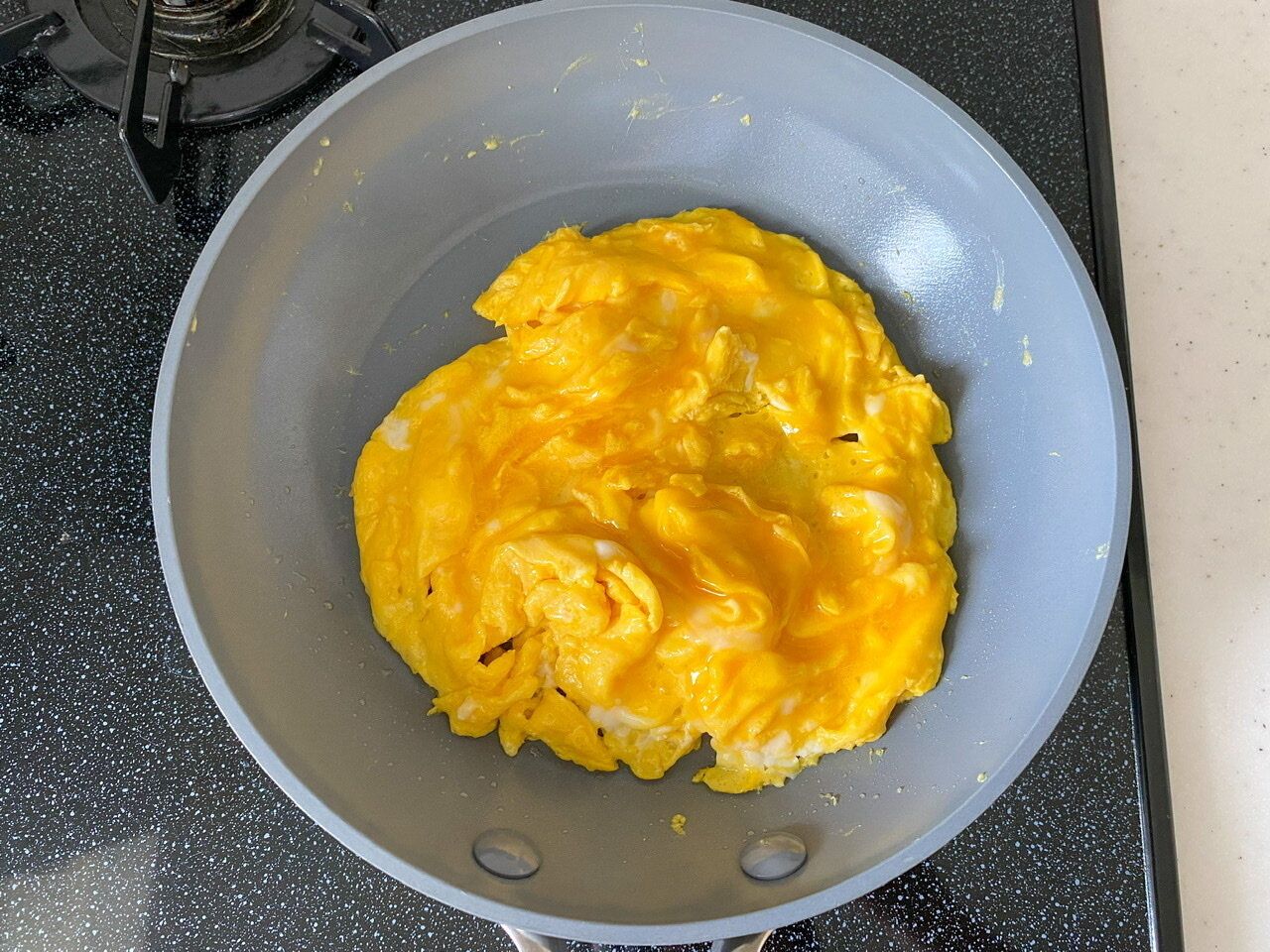 半熟に作った卵を、火を消してからフライパンに置いたままにしておくと、15〜20秒程度でもあっという間に余熱で火が入りかたくなってしまいますので、ごはんは卵を焼く直前に丼によそっておいてくださいね!