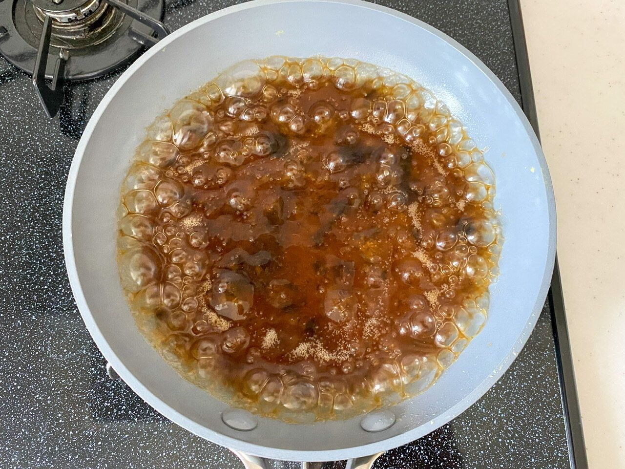 (3)フライパンの汚れを軽く拭き取り、再びよく混ぜたBを注ぎ、中火でしっかり煮立たせる。とろみがついたら火を止める。