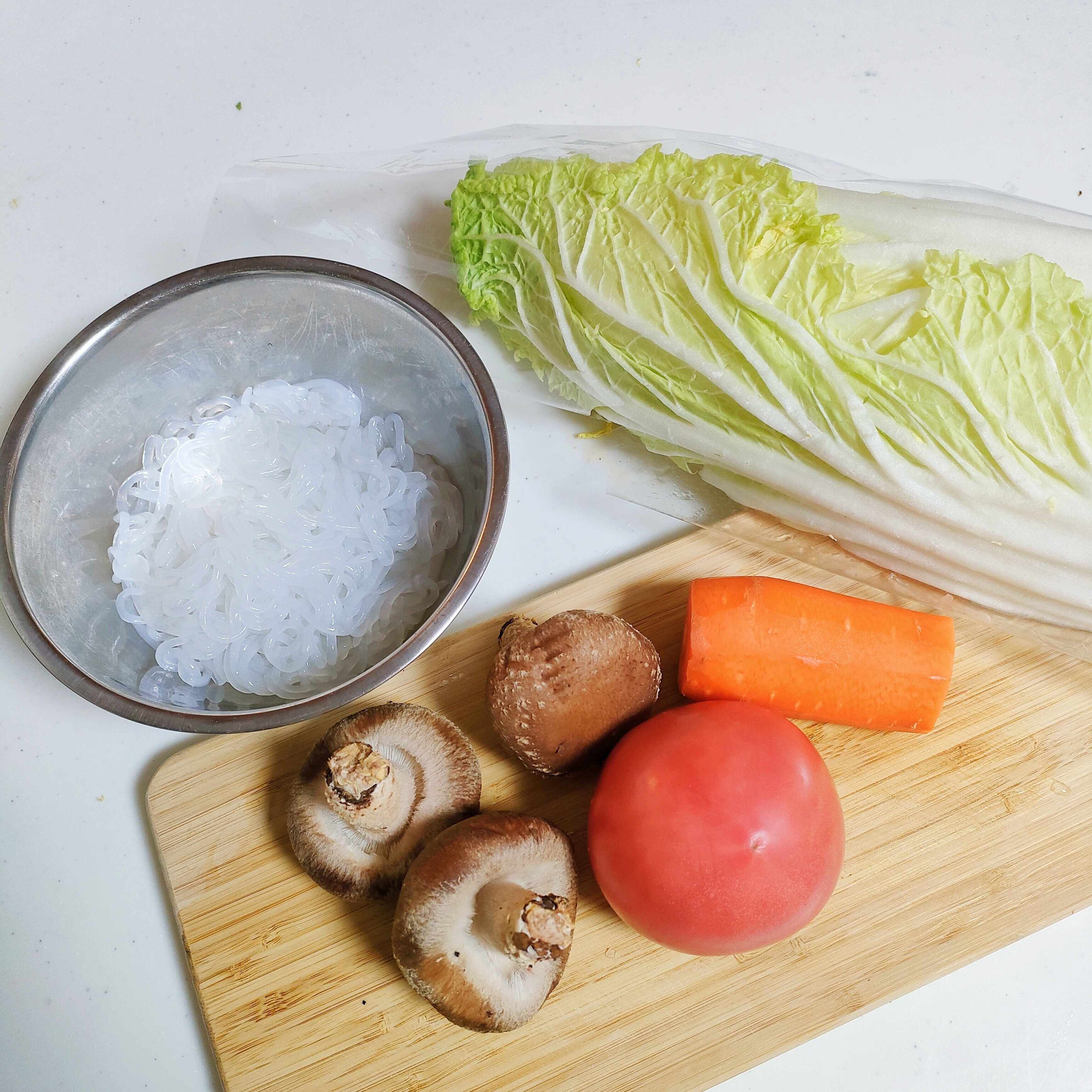 1 食材を全て1センチ角ほどにカットして(トマト、人参、しいたけ、白菜)、