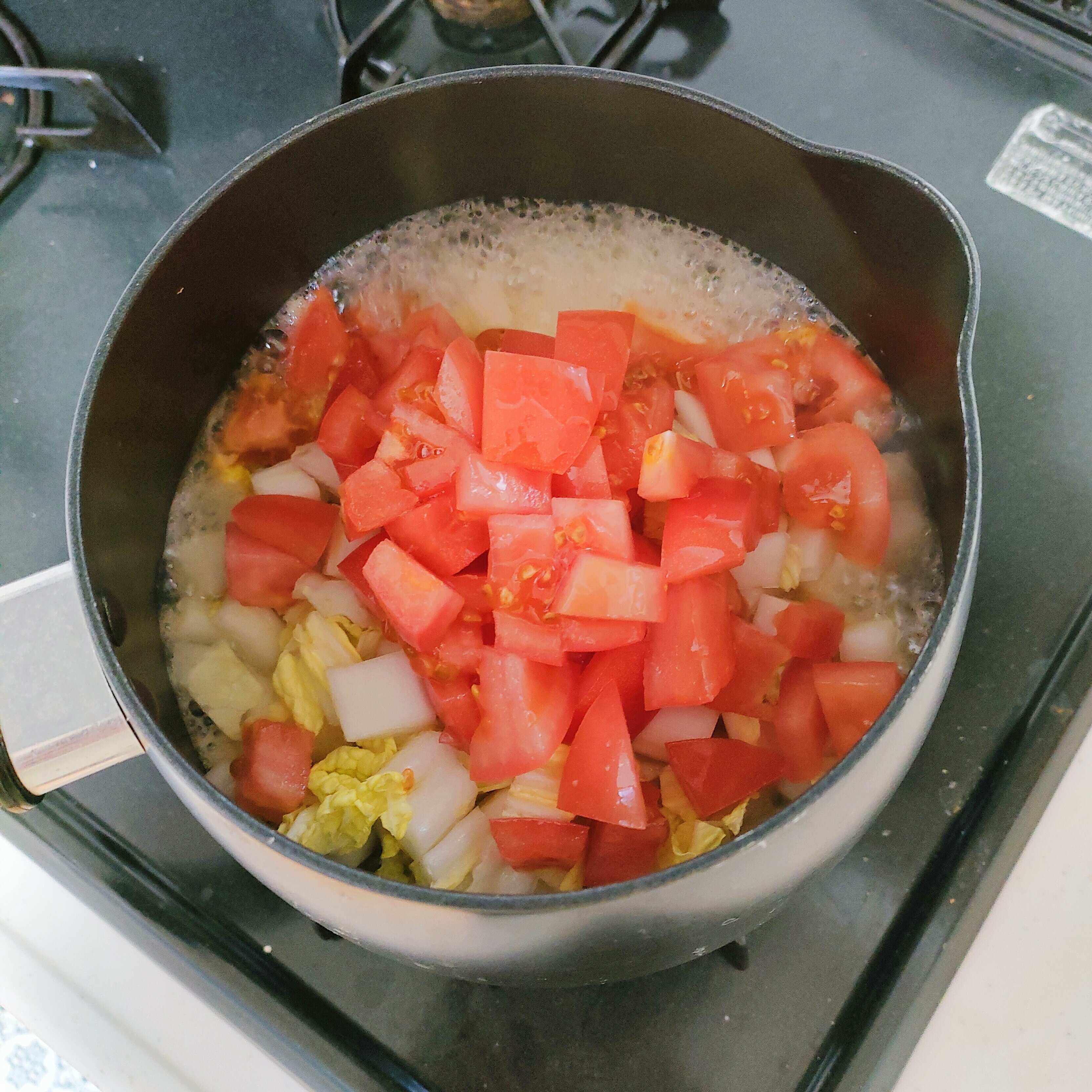 3 沸騰したら弱から中火にして、白菜、しらたき、トマトをいれる