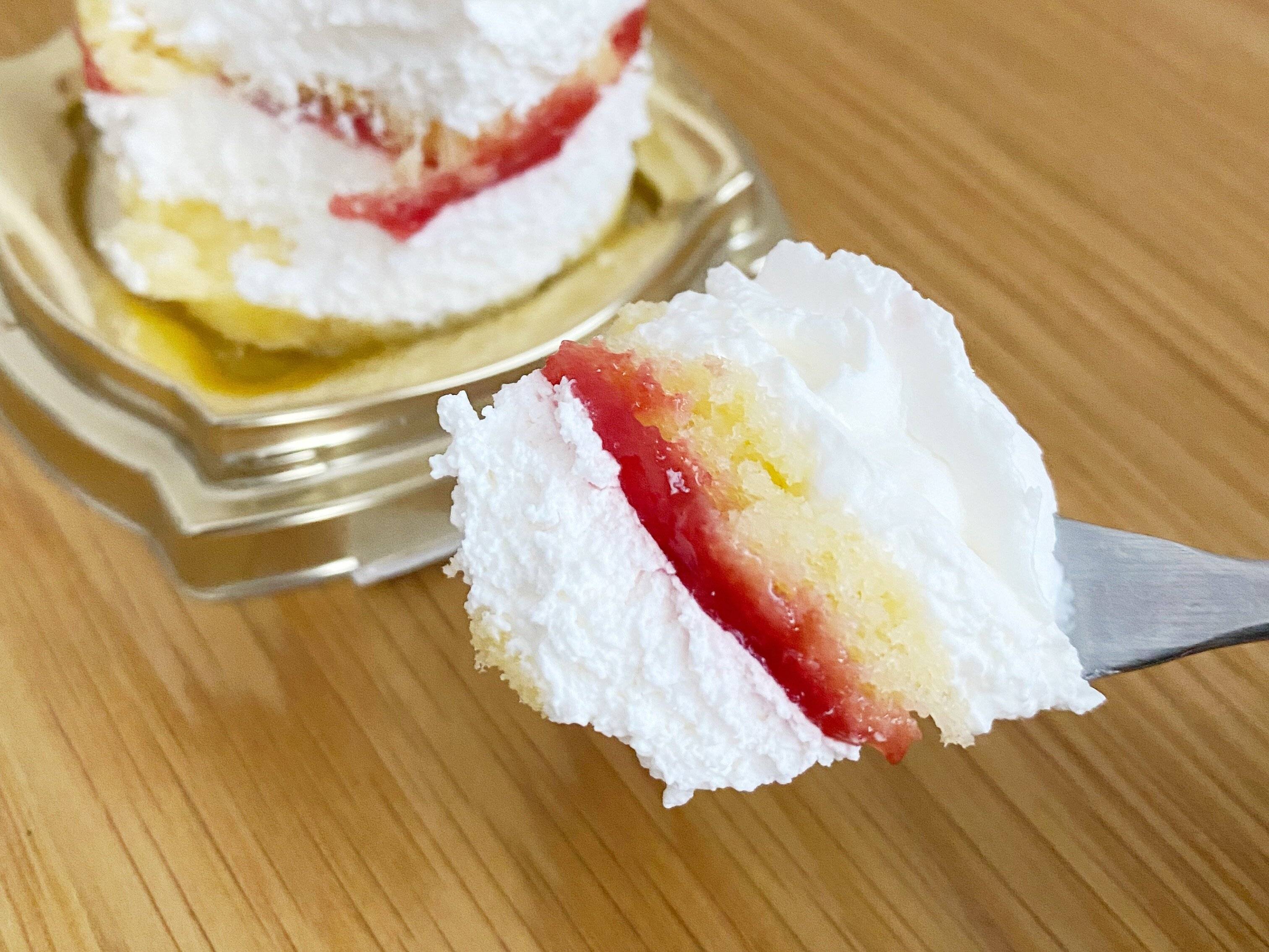 口どけの良いクリームとふわふわでしっとりのスポンジ生地、甘酸っぱいいちごソースが混ざり合うと至福のおいしさ!