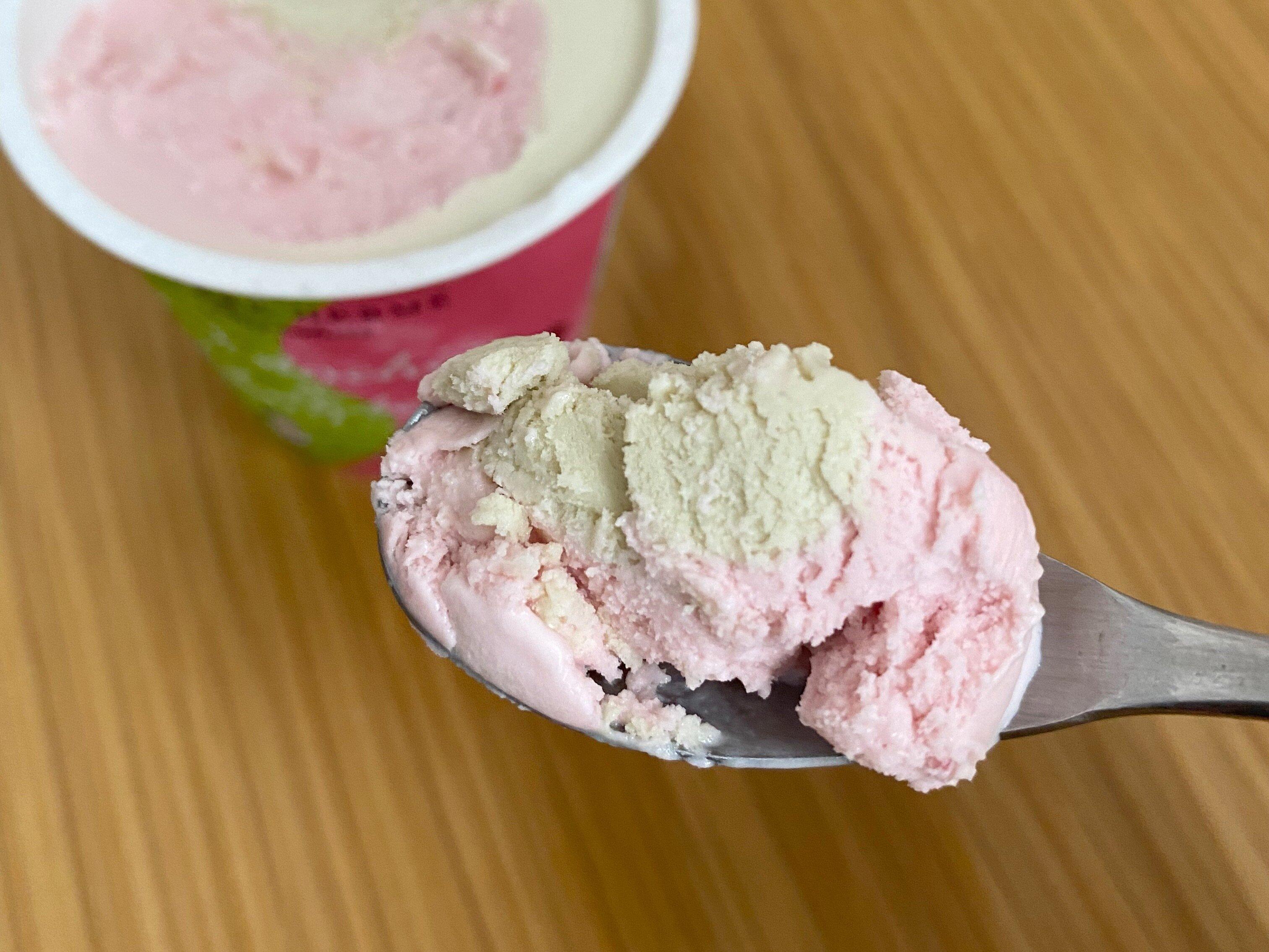 ピスタチオアイスは杏仁豆腐やアーモンドを思わせる味わい。濃厚で後味にほんのり香ばしさがあり、ラズベリーアイスとは対照的な味わいです。
