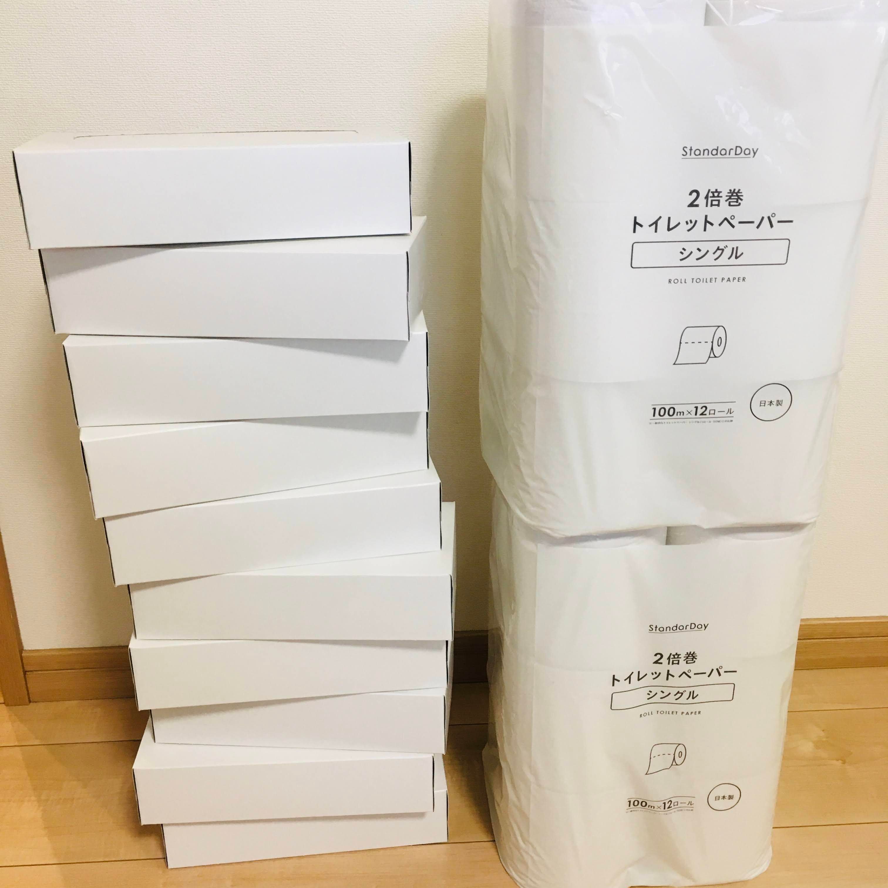 ティッシュペーパーは200組入り、トイレットペーパーは2倍巻き。