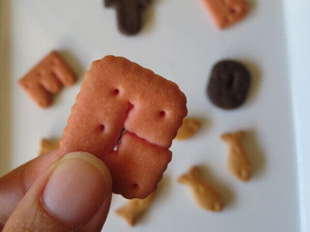 新しい味の方は形がいろいろありそうだったので適当に皿に出してながめてみると、アルファベットの形でした。