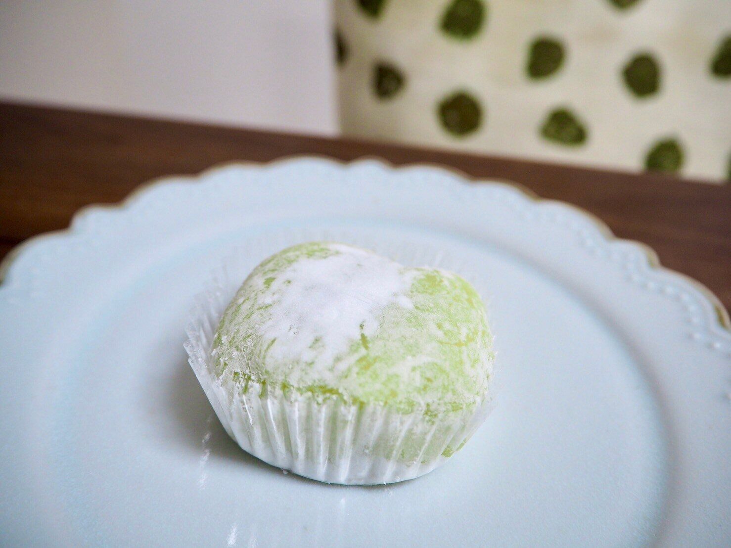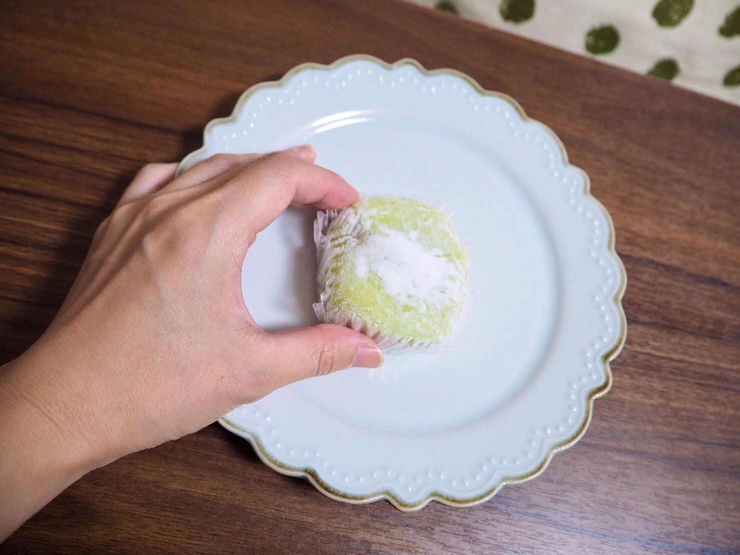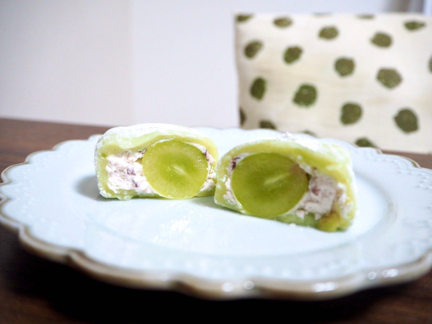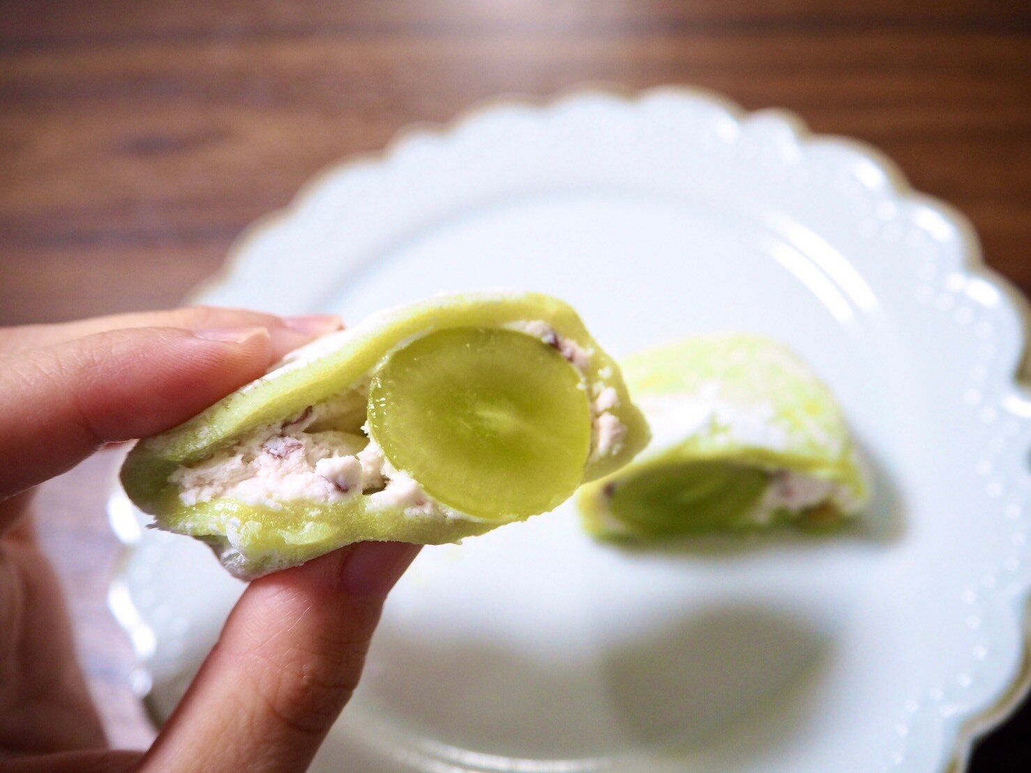 中身を取り出してみると、きれいなマスカット色の大福が登場です。