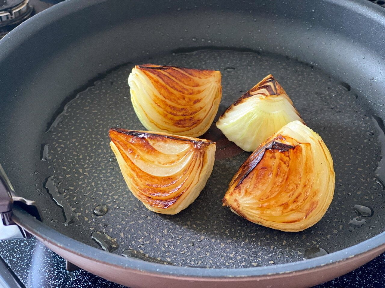 (2) フライパンにオリーブ油(約小さじ2)を熱し、断面を下にして新玉ねぎを並べて蓋をして焼く。途中3分~3分半ほどたったら、少し火を弱めてもう片側の断面を同程度焼く。焼き目がついたら外側の面を下にして2分焼いて器に取り出す。