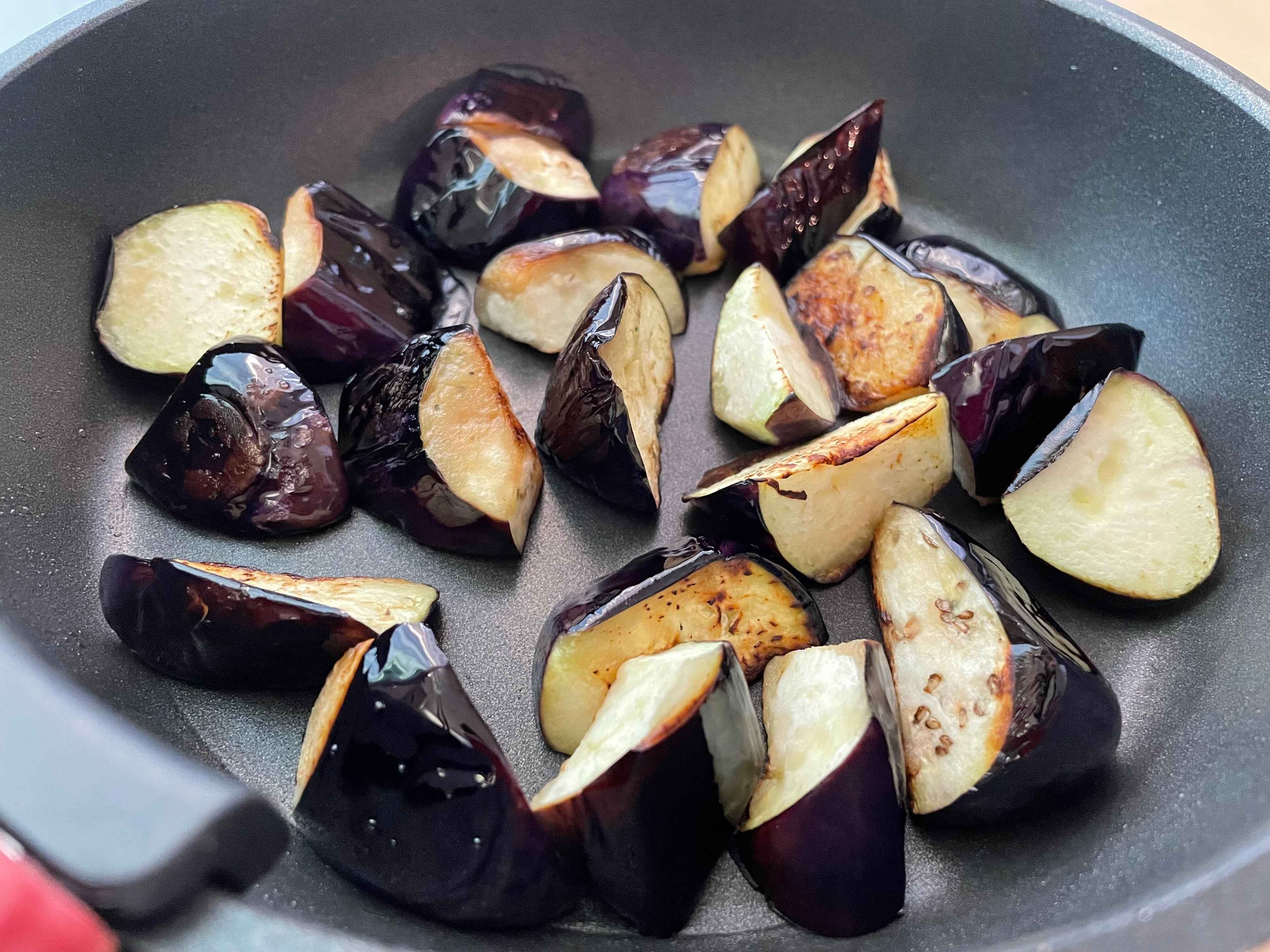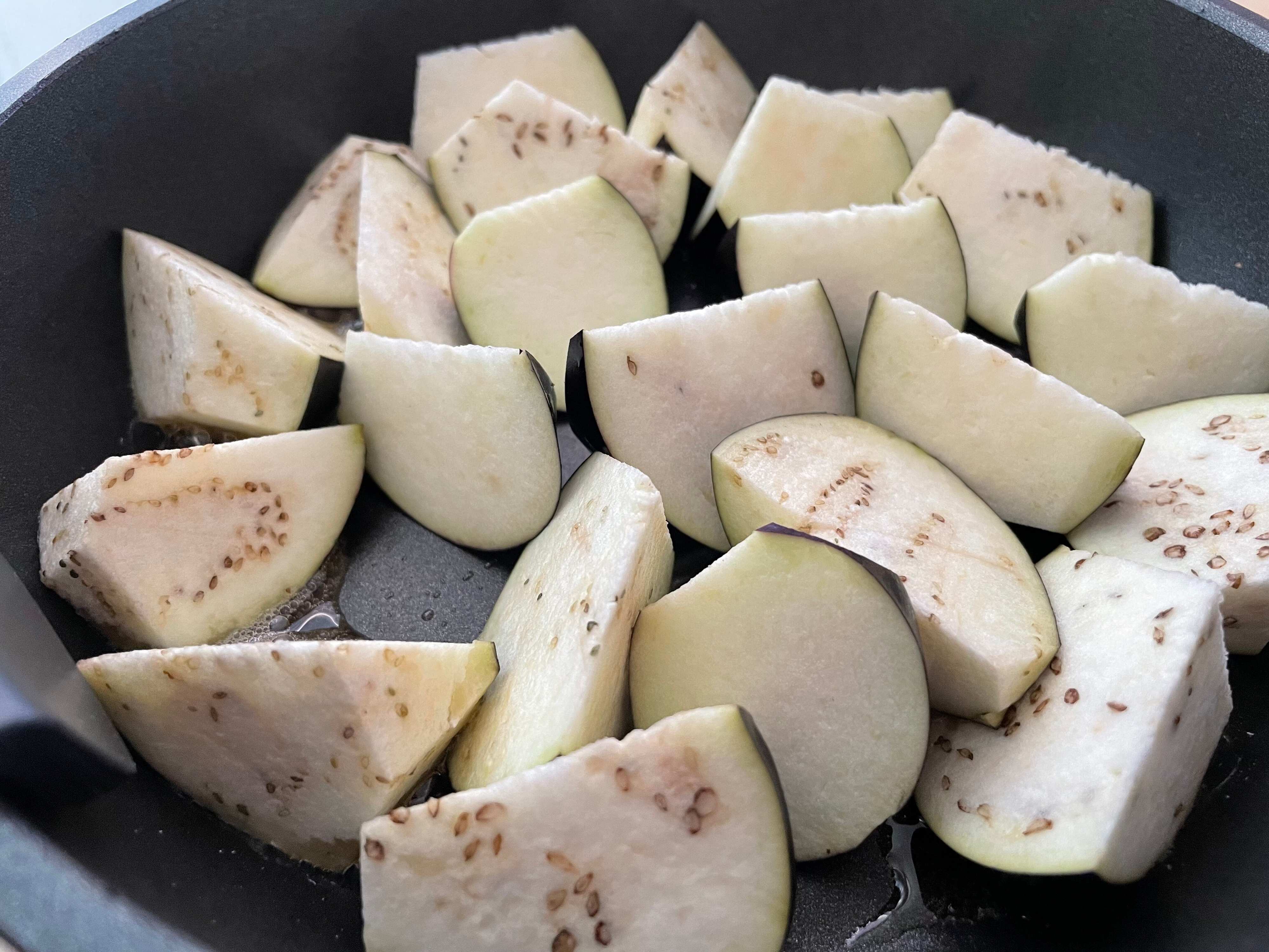 (1) フライパンにサラダ油を熱し、乱切りにしたなすをいれる。