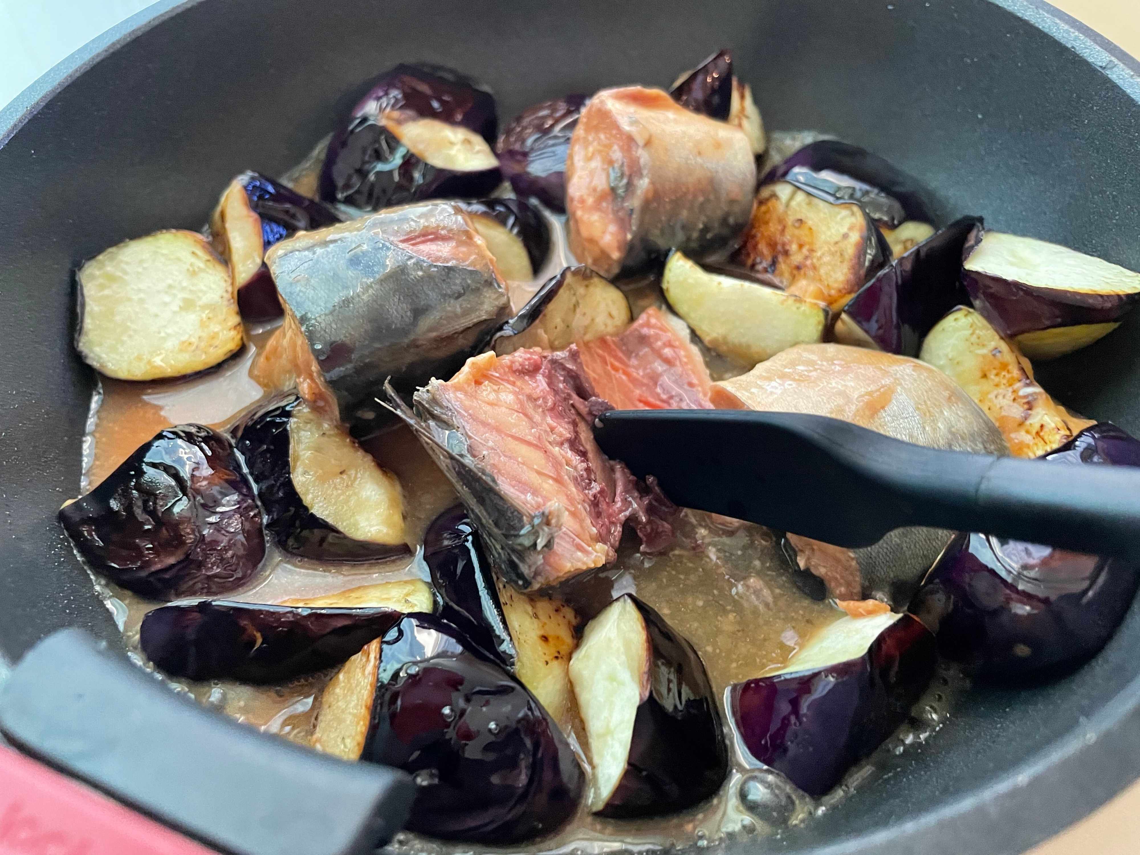 少し濃いめのさば缶の汁が、なすに染み込んでジューシーでやみつきの味に仕上がります。