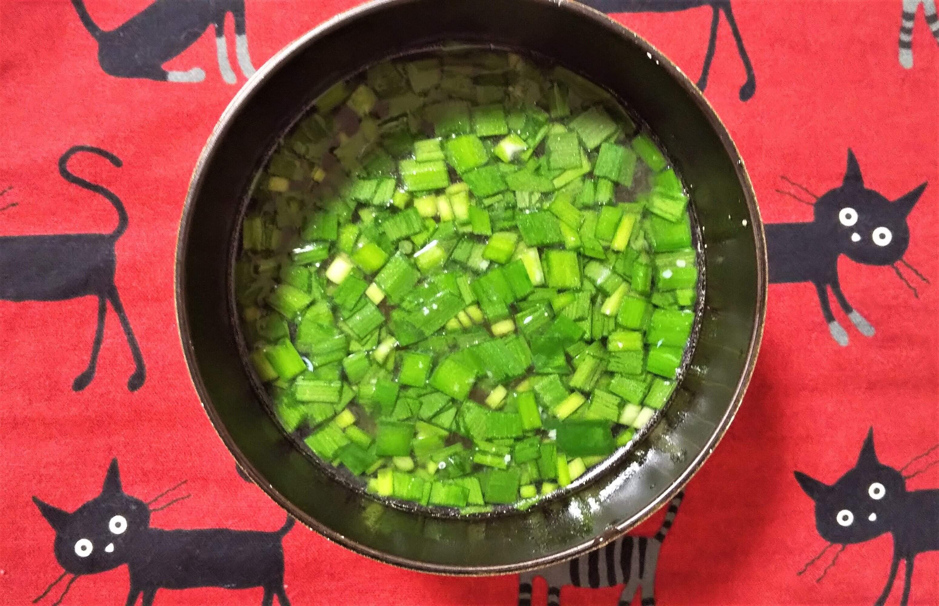 見た目は、ニラが浮いているだけの映えない味噌汁ですが、ニラ・しょうが・ごま油の三重奏で、なかなか食欲をそそる香りに仕上がります。