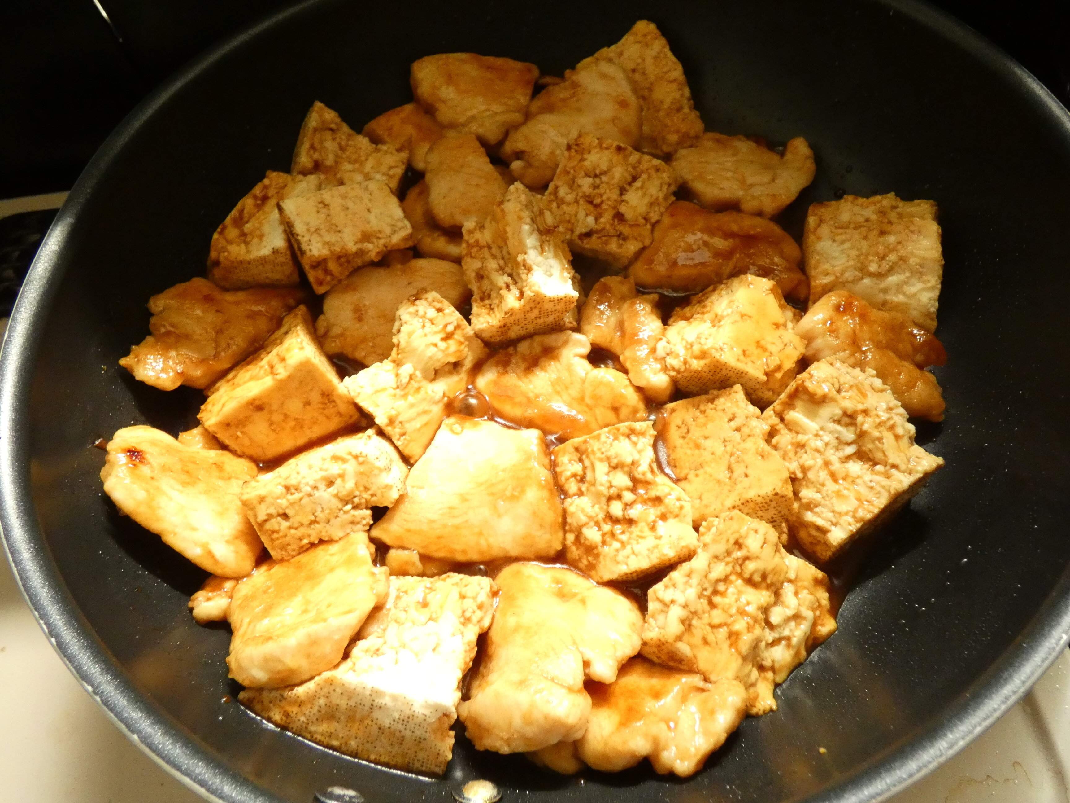 3.両面きつね色になったら、調味料と焼き豆腐を手で大きくちぎりながら入れます。2~3分煮て全体に味が絡んだら完成。