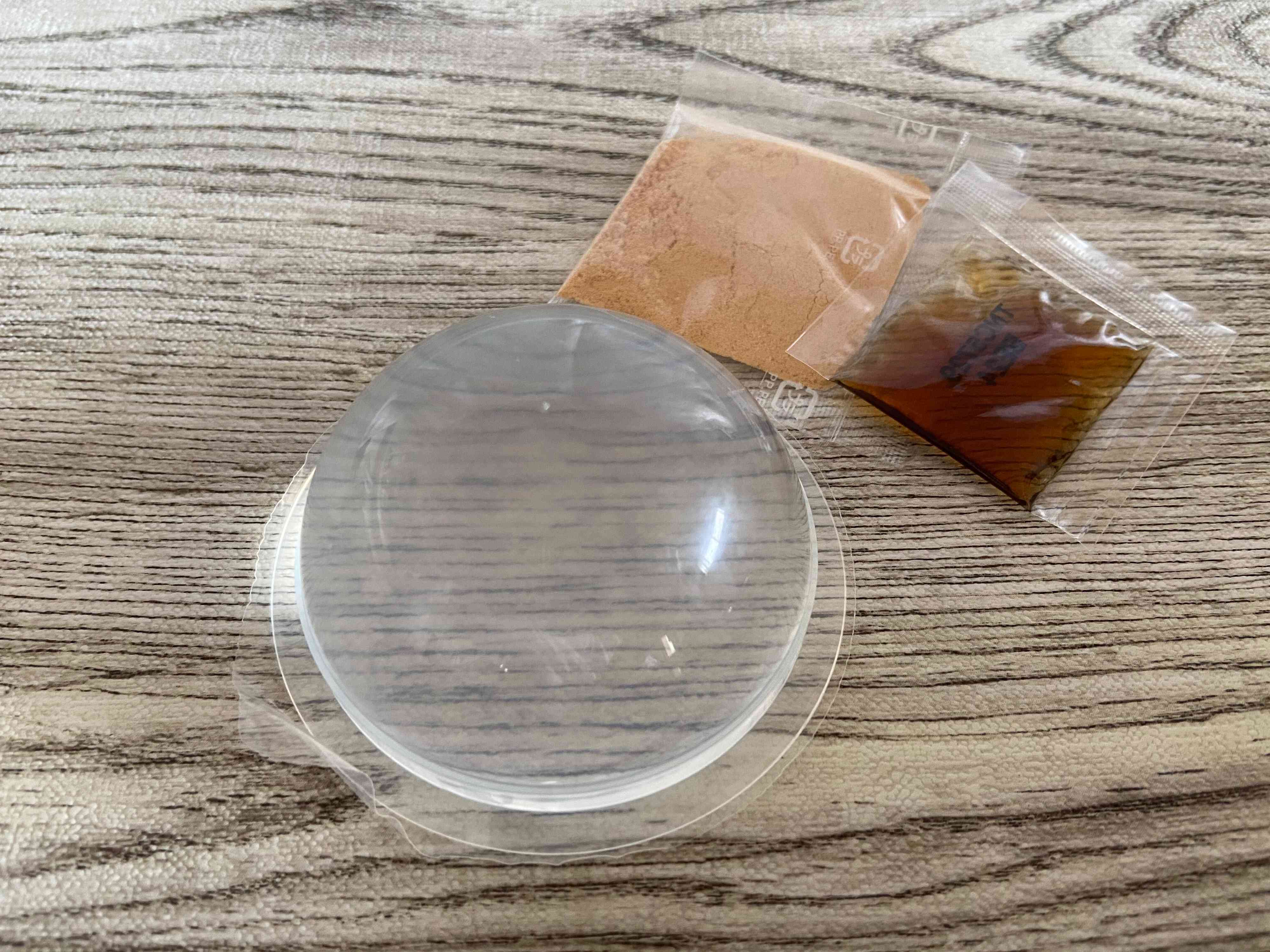 袋から出してみました。テーブルの木目がくっきりと透き通るほどクリアな水わらび餅。