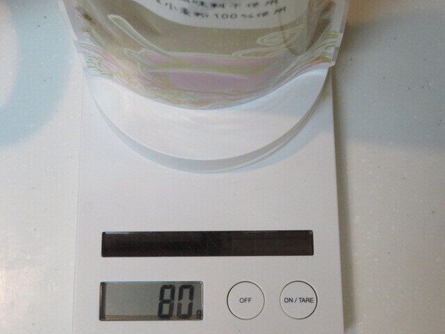 内容量は150gなので半分の75gを使ったら80gになるはずと計算し、その重さになるよう少しずつ取り出せばOK。