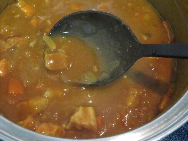 カレールーを入れて溶かし、少しかき混ぜながら軽く沸騰させたら完成。