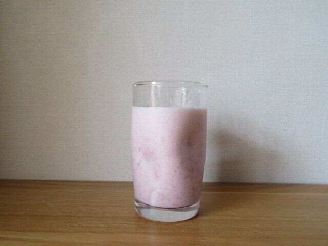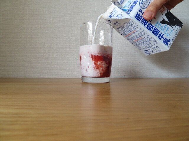 できあがったいちごミルクは、持ち上げると下の方に果肉が沈んでいます。