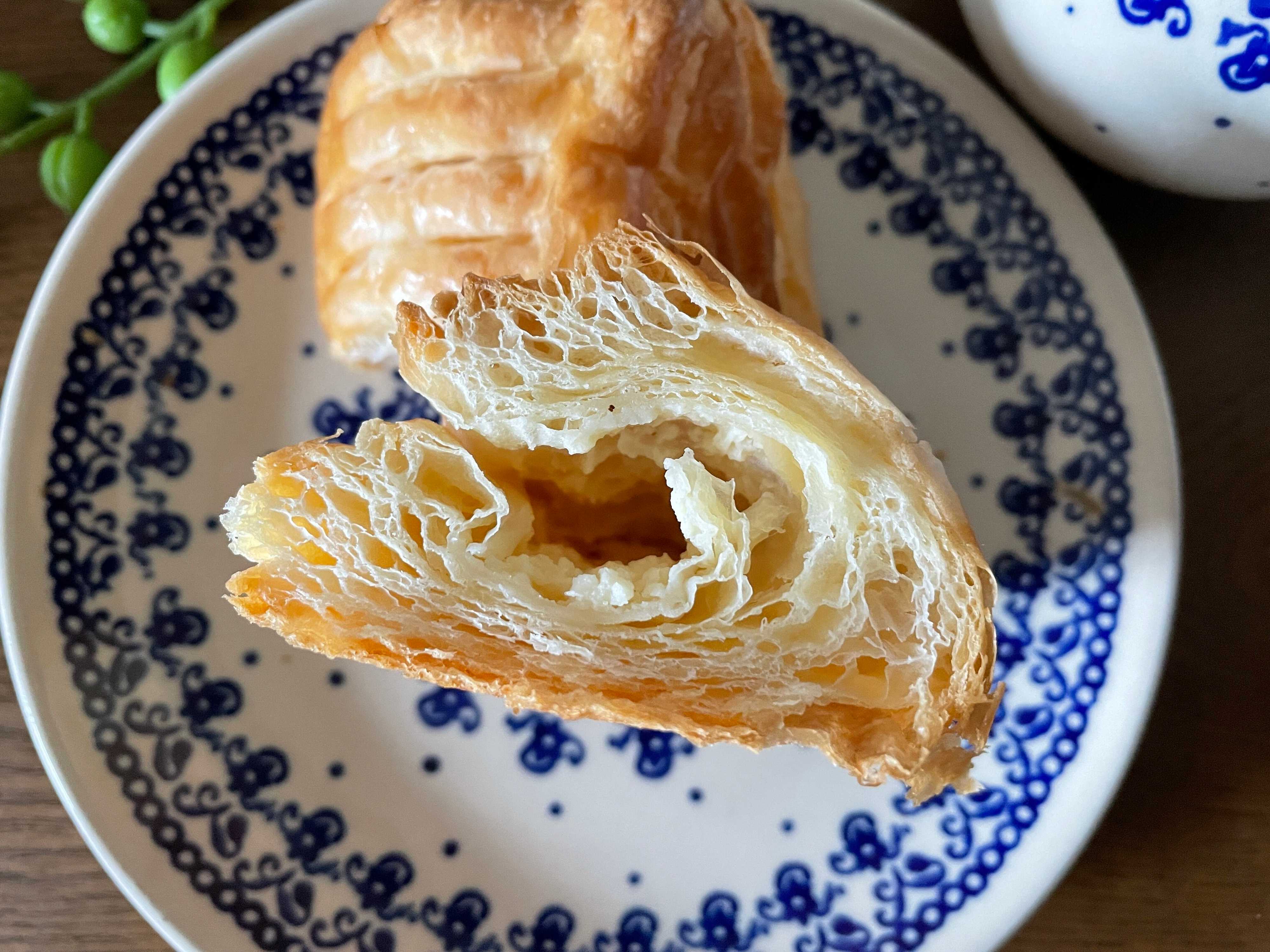 半分に切って、中を見てみると、デニッシュ生地が何層にも重なっています。
