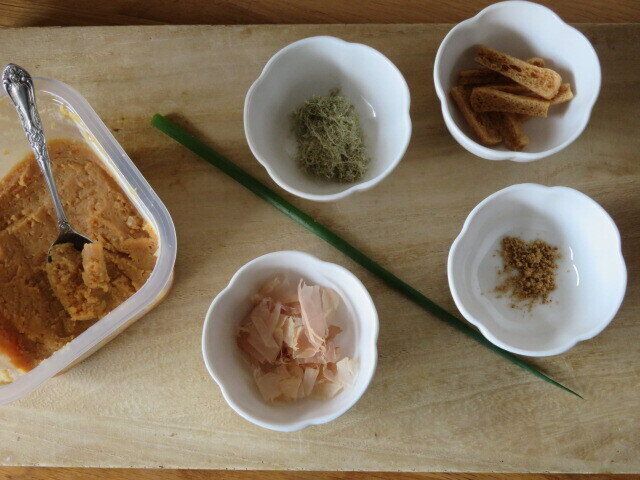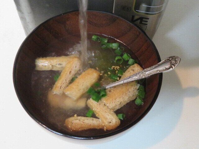 みそ汁の材料は、みそ(出汁入りでないもの)ティースプーン1杯、ネギ1/2本、すりごま適量、かつおぶしととろろ昆布をそれぞれひとつまみ、きざみあげ6、7切れです。
