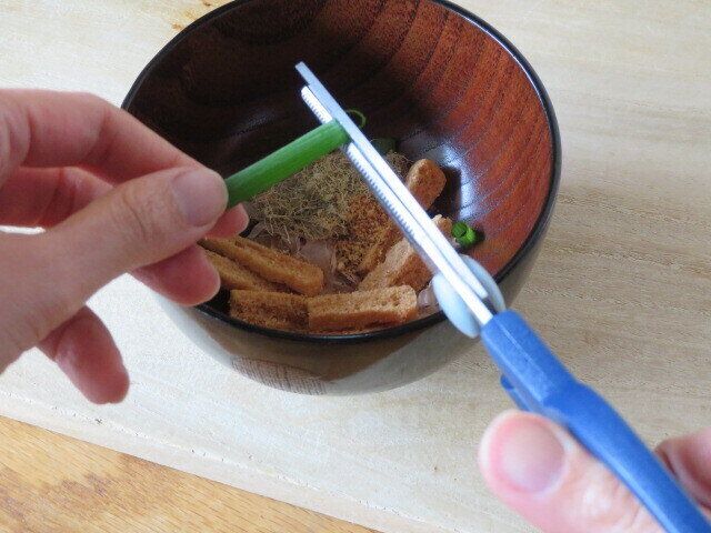 おわんの上に持ってきてキッチンばさみで切るだけです。