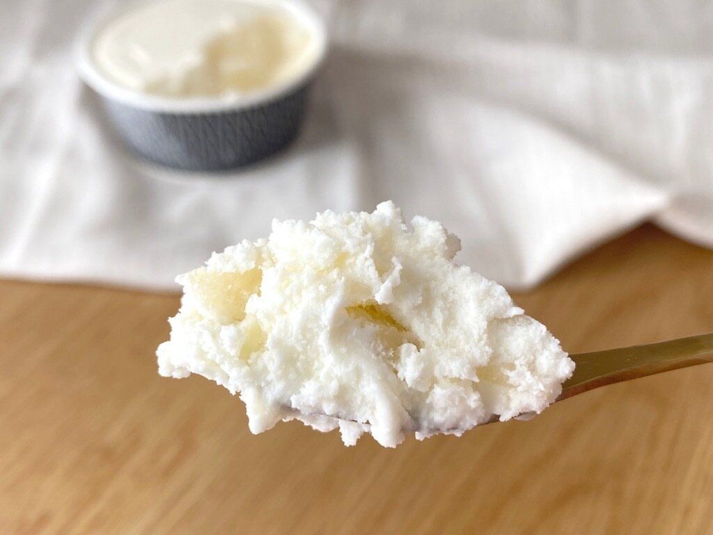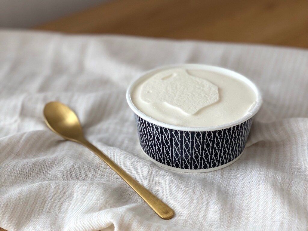 角切り白桃はゴロっとたくさん入っていて、どこを食べても白桃が口に入ってきます。シャリシャリと食感も良く、なめらかなアイスのアクセントになっています。口の中にひろがる杏仁の風味と白桃の甘酸っぱさは相性がよく、後味にほんのり香る洋酒の風味は大人テイストで上品。