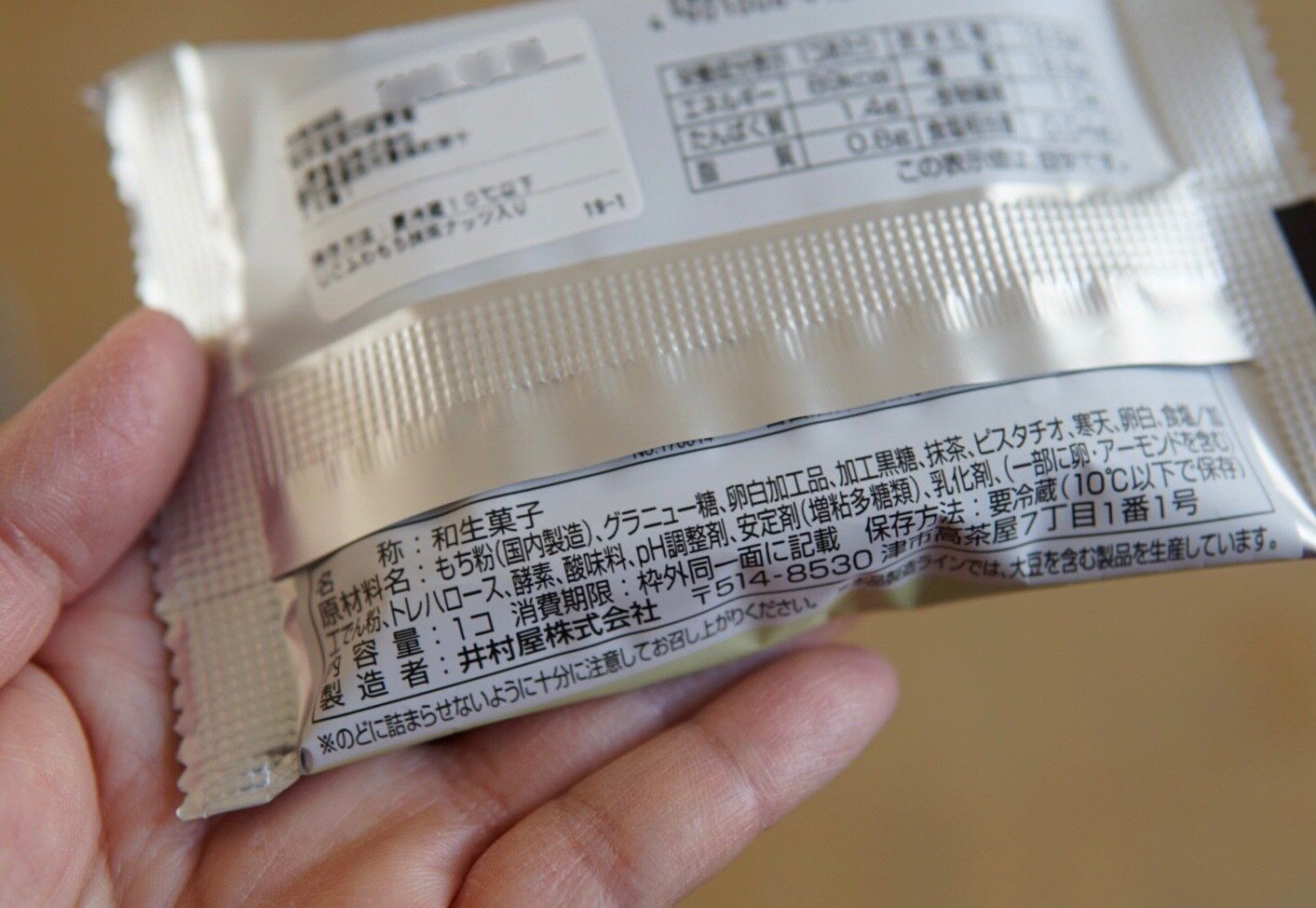 世の中にはクリスマスソングが溢れ、気分もウキウキケーキにむかうこの時期に、あえて和な抹茶もちスイーツを販売するローソンの意図が気になります。クリスマス後のお正月を意識しているのかもしれませんね。パッケージを見たときのくにゃっと重なり合うイメージ写真に惹かれて思わず手に取りました。裏面表記を確認すると、製造は和スイーツのイメージが強い「井村屋」そして、ナッツはピスタチオだということがわかります。