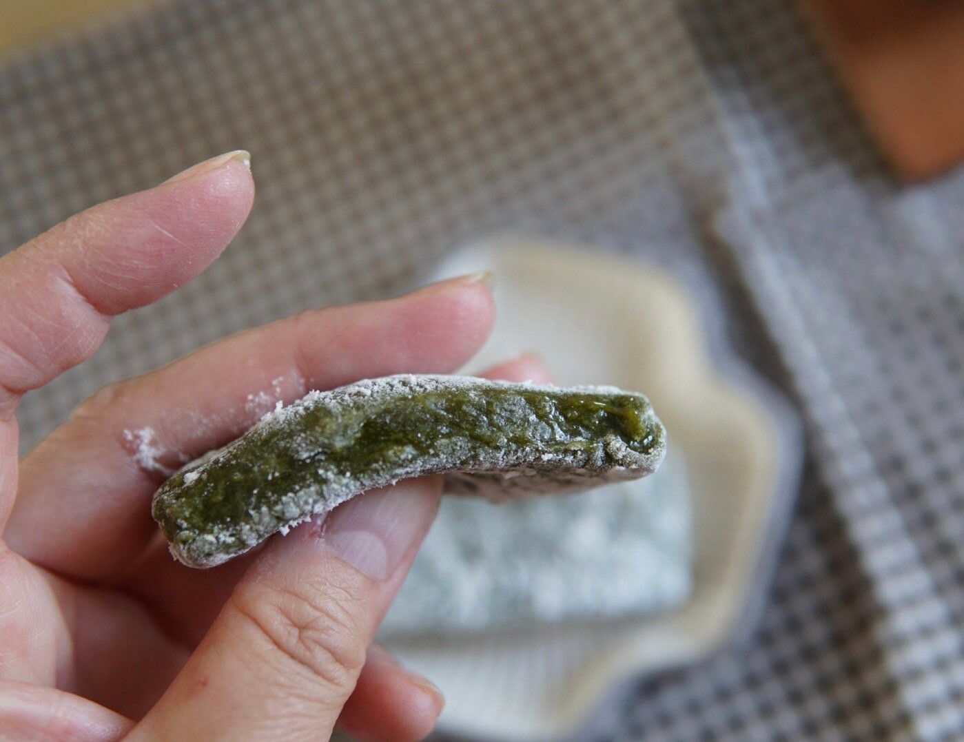 ほっぺたのような柔らかさのふわっとした抹茶のおもち。アクセントにピスタチオをいれました。