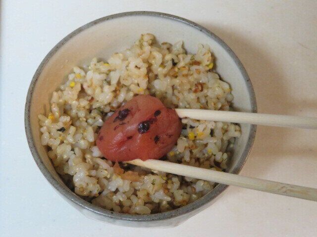 ご飯をお茶碗によそってふりかけを混ぜ込み、くぼみをつくって梅干しを押し込み、ラップの上にひっくり返して包んで形を整えて終わり。
