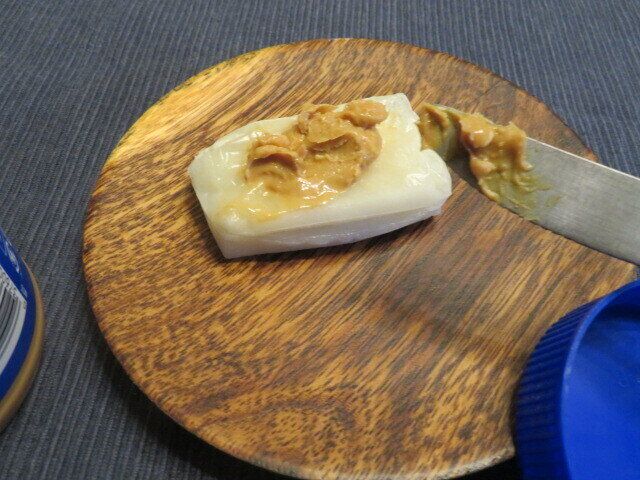 焼いてすぐのあつあつの餅にピーナッツバターをぬって食べるのです。