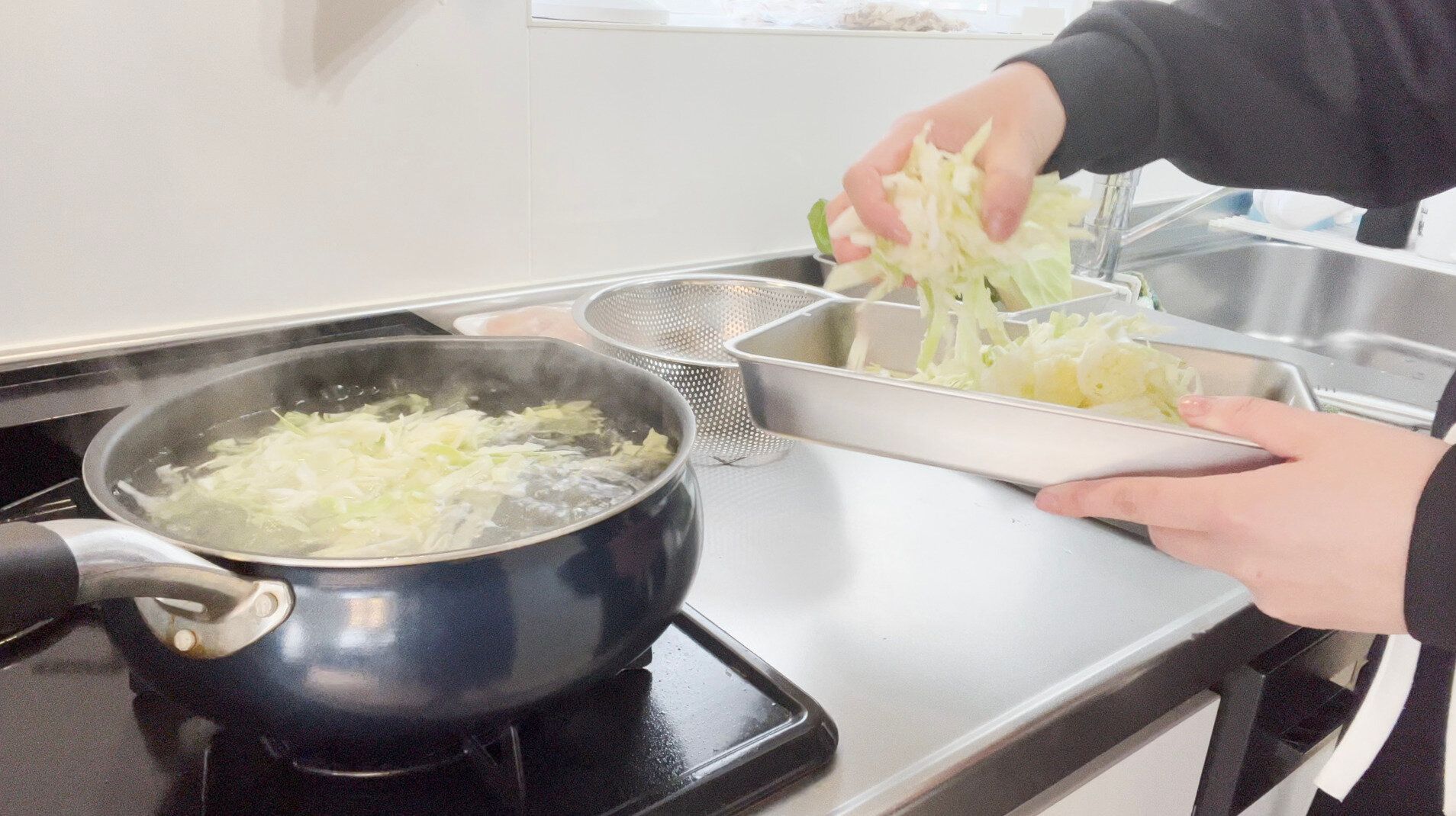 沸騰した鍋に5mmくらいの千切りにしたキャベツを入れ、20~30秒くらいで取り出します。余熱が取れたら軽く水気を絞って保存容器へ。