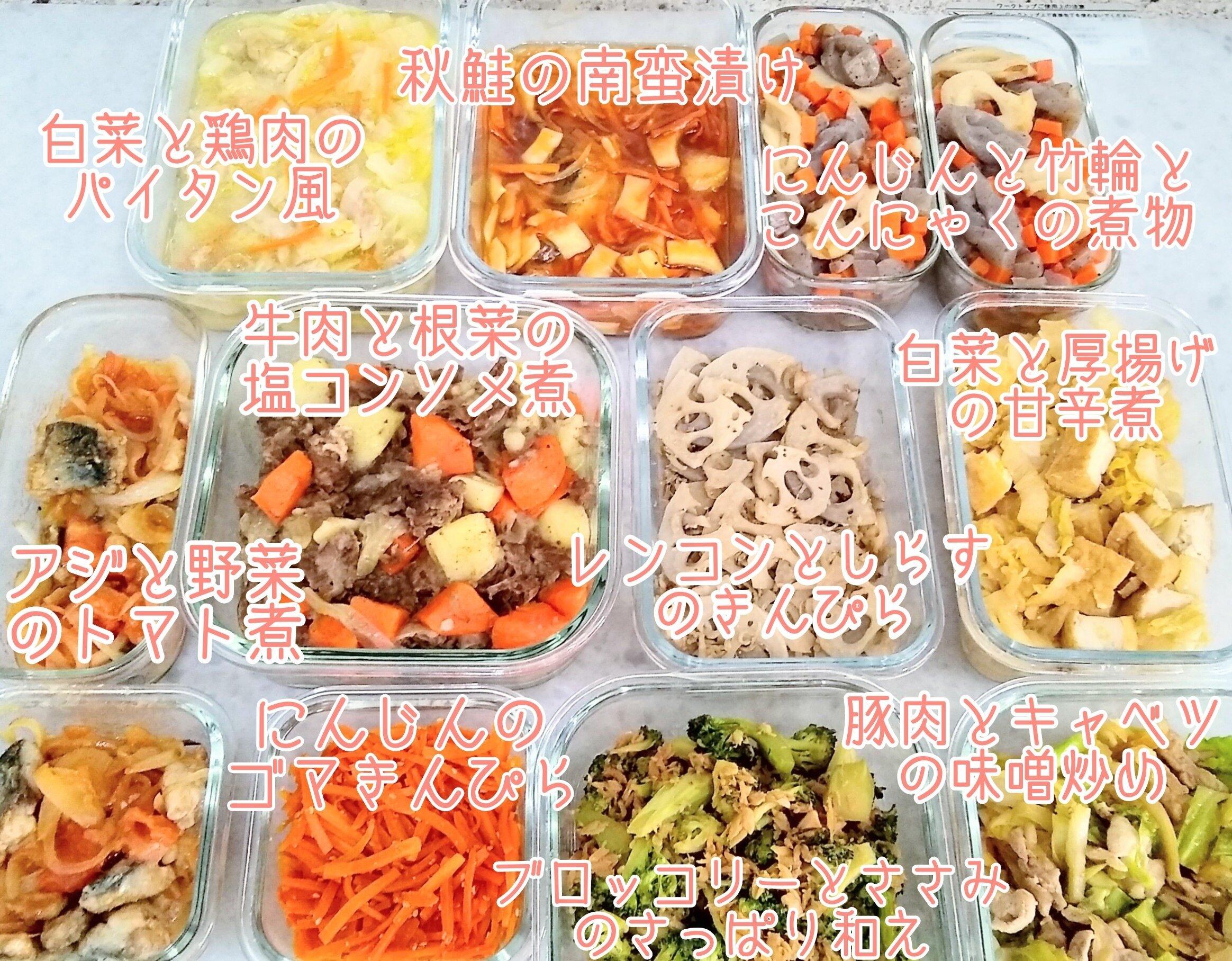 旬の野菜を使った料理が人気で、たとえば秋~冬の作り置きの例がこちら。