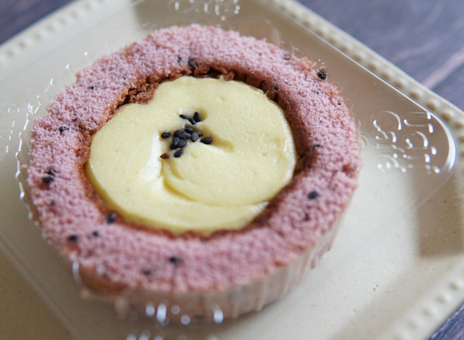 紫芋風の生地には黒ゴマも入っており、一見奇抜、面白い見た目だなと個人的に感じました。中央には、紅はるかの焼き芋ペースト入り芋クリームが上、ホイップクリームがその下に入っています。濃厚な芋クリームが半分以上の割合でたっぷり入っているので、お芋感をたっぷりと味わうことができます。