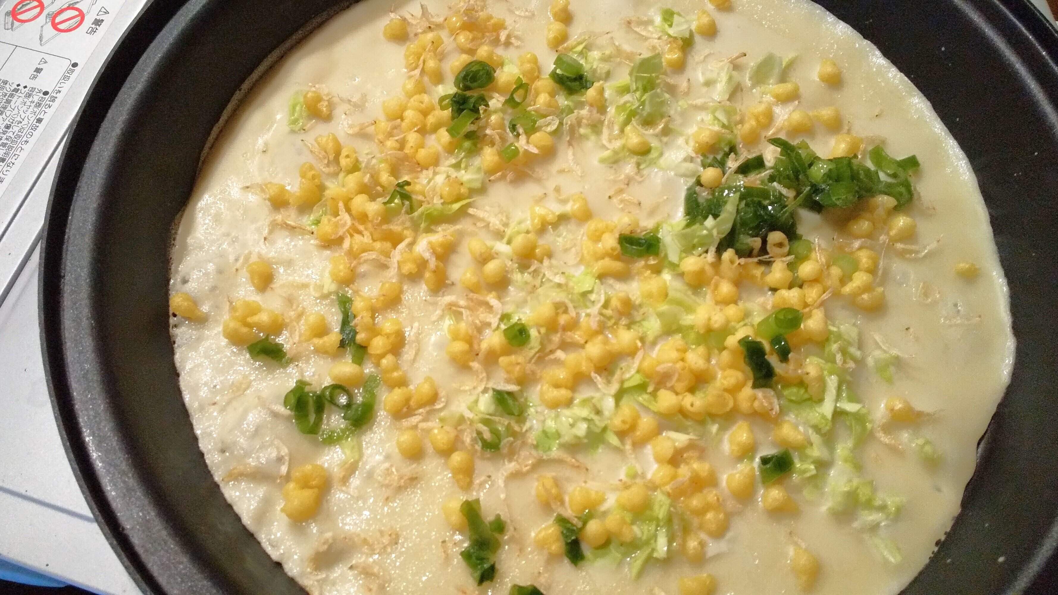 本来は、型にそれぞれ生地とタコ、天かすやねぎなどの具を入れて丸めて焼くのですが、タコ焼き器が温まらないとなれば他の方法を考える必要があります。
