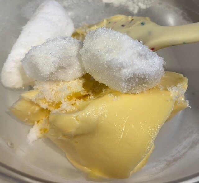 ボウルに砂糖、マーガリンを入れる。マーガリンは作る前に常温にしておくと時短になります。