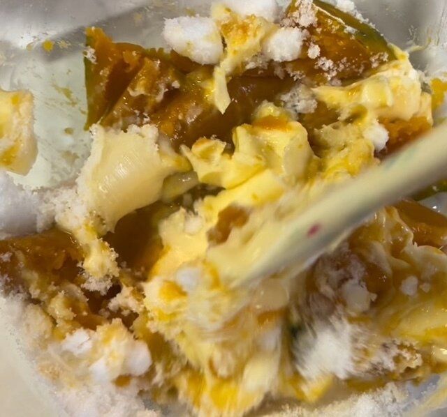 かぼちゃを潰しながら、砂糖、マーガリンをよくなじませながら全体をぐるぐる混ぜる。