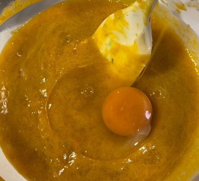 少しづつ入れた方が混ざりやすい。ここでもしっかり混ぜる。